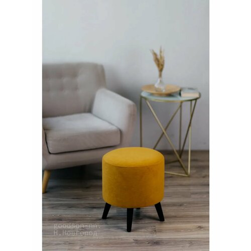 Обивка пуфа выполнена из приятной на ощупь велюровый ткани, горчичного цвета, устойчивой к истиранию.