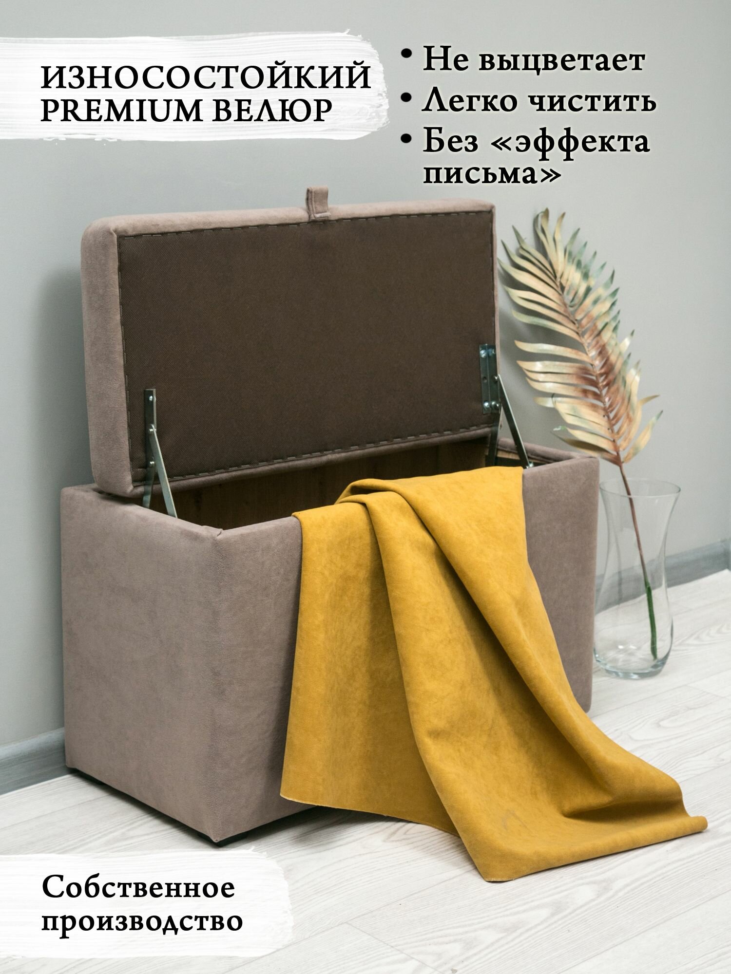 Трендовая банкетка будет отлично смотреться в гостиной и спальне, гардеробной и в детской комнате. Мягкая износостойкая и антивандальная велюровая обивка не пропускает влагу. Она прошита прочными швами и качественными нитями, легко чиститься мыльным раствором.