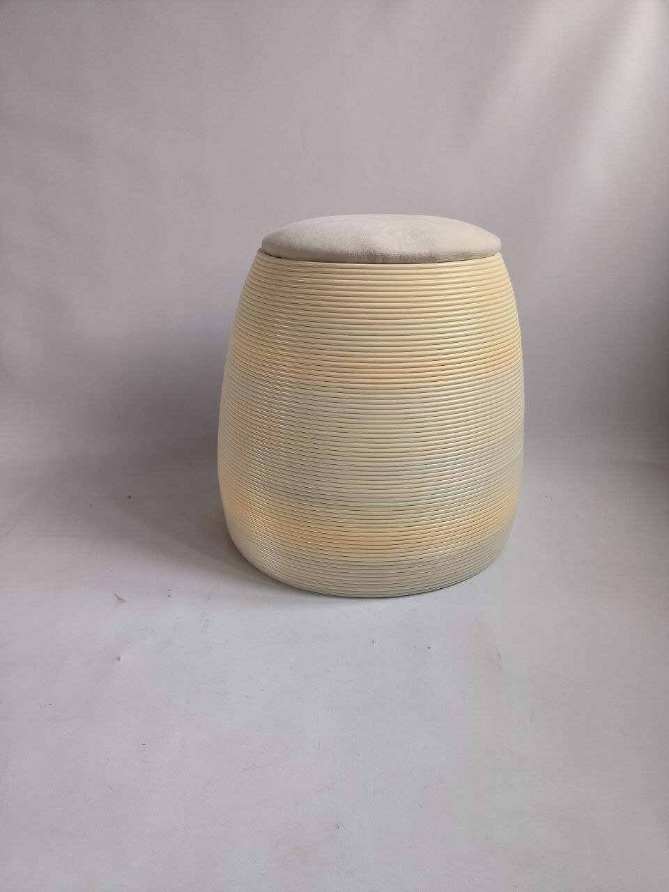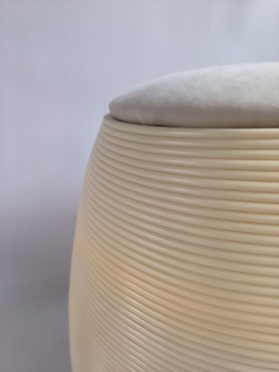 Особенностью пуфика является его изготовление с использованием 3D-печати. Это позволяет создавать уникальные и качественные изделия из вторичного пластика.