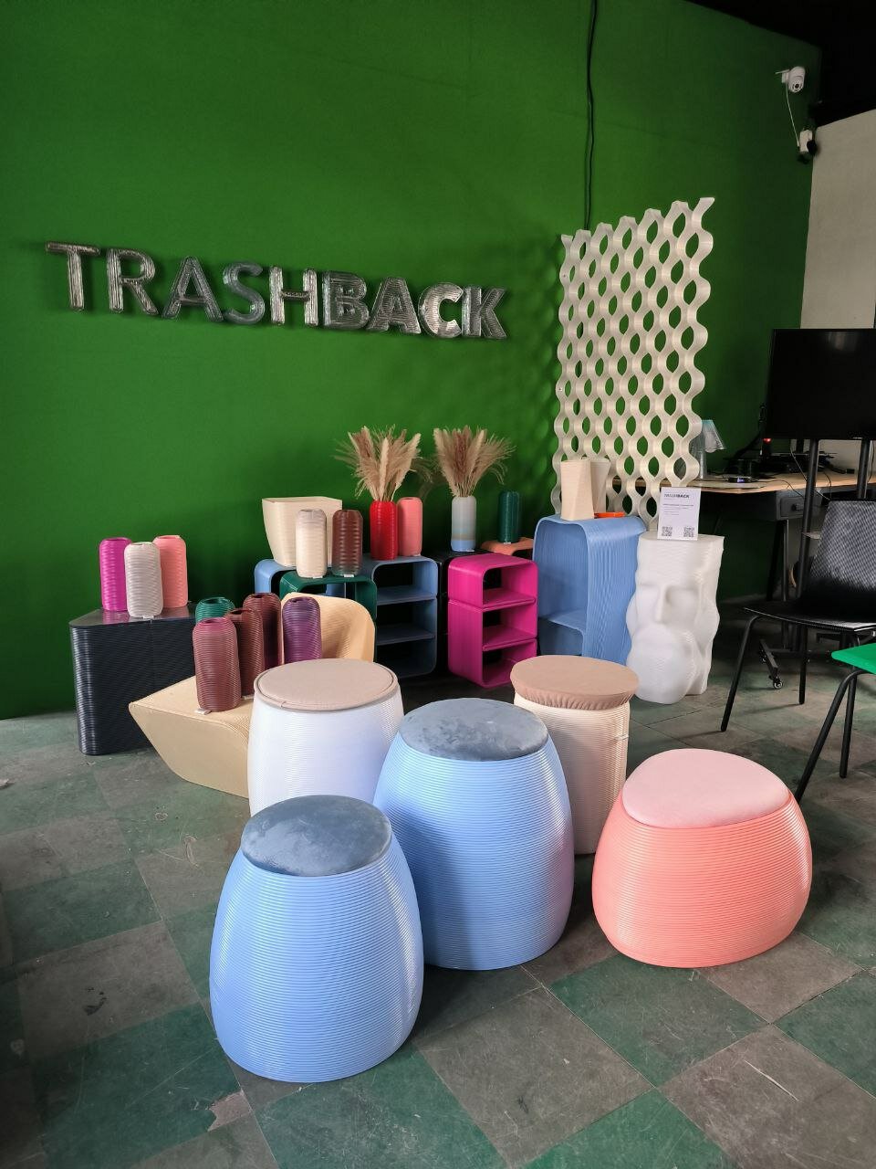Особенностью пуфика является его изготовление с использованием 3D-печати. Это позволяет создавать уникальные и качественные изделия из вторичного пластика.