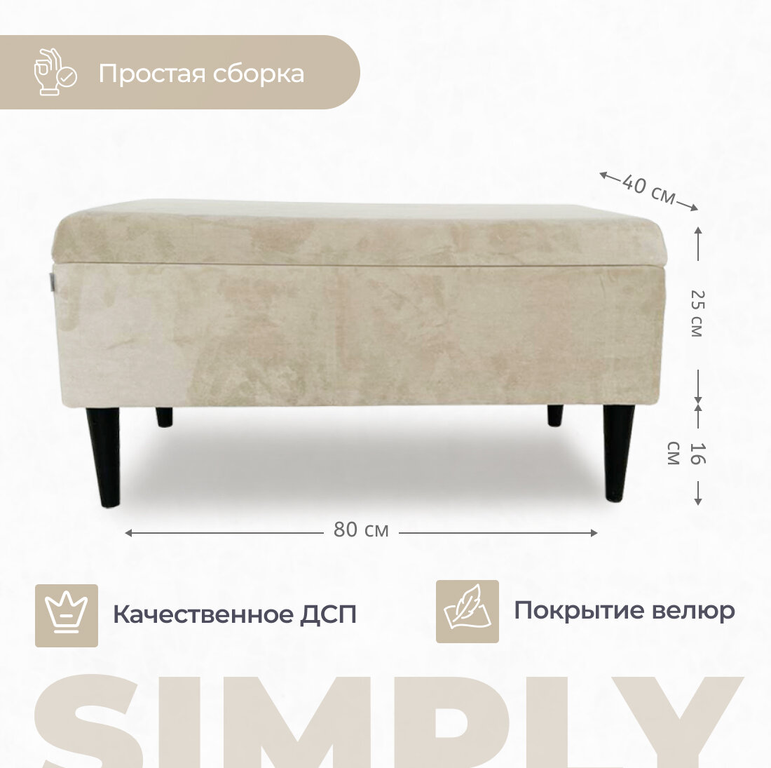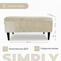 Пуфик в прихожую дженкс от бренда EL TODO сочетает в себе функциональность и стильный дизайн. Его размеры составляют 80х40 см, с ножками высотой 16 см и ящиком для хранения глубиной 18 см, что делает его идеальным выбором для использования в коридоре или прихожей. Пуфик выполнен в бежевом цвете, обладает мягкой обивкой и удобным ящиком для хранения. Основные характеристики пуфика банкетки в прихожую:- Размеры: 80х40 см, ножки 16 см, ящик 25 см.- Цвет: бежевый.- Тип: пуфик, банкетка.- Предназначение: для размещения в прихожей, коридоре.- Материал изготовления: ДСП, мебельная ткань.- Наличие ящика для хранения мелочей.- Рекомендуемая нагрузка: 110 кг. Банкетка с ящиком отличается удобством и функциональностью благодаря своему компактному размеру и наличию ящика для хранения. Каркас изготовлен из качественной ДСП, который обтянут мебельной тканью, что придает пуфику комфортную обивку. Черные ножки обеспечивают устойчивость и прочность конструкции. Металлический подъемный механизм на крышке ящика обеспечивает удобство при открывании. Специальные утяжки на крышке, помимо декоративной функции, помогают сохранить целостность ткани. Рекомендуемая нагрузка на пуфик составляет 110 кг. Сборка данной модели пуфика проста и не требует особых навыков - достаточно прикрепить ножки, чтобы он был готов к использованию. Пуфик - идеальное сочетание практичности, стиля и качества, которое станет как функциональным, так и эстетически привлекательным элементом вашего интерьера. Пуфик отлично подойдет для размещения на кухне, в гостиной, прихожей, на балконе, в офисе, и для использования с туалетным столиком.