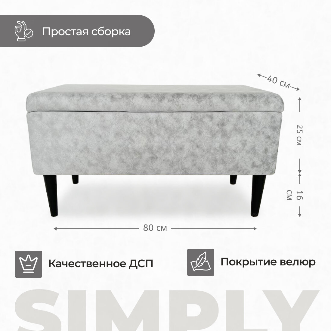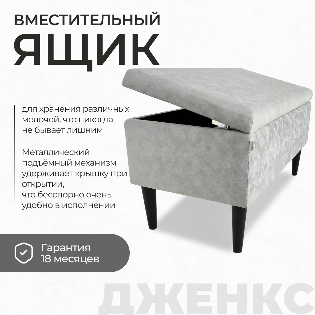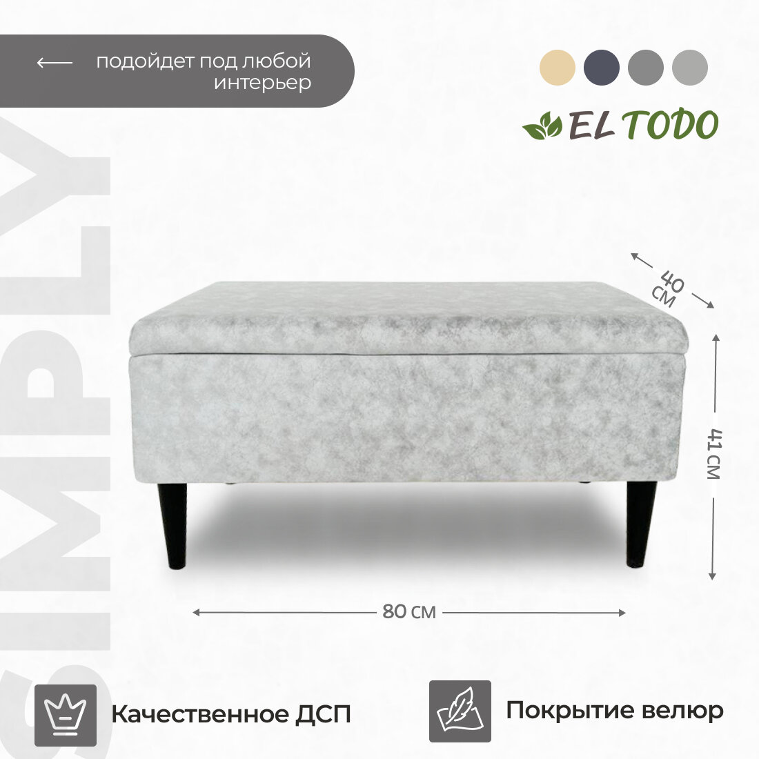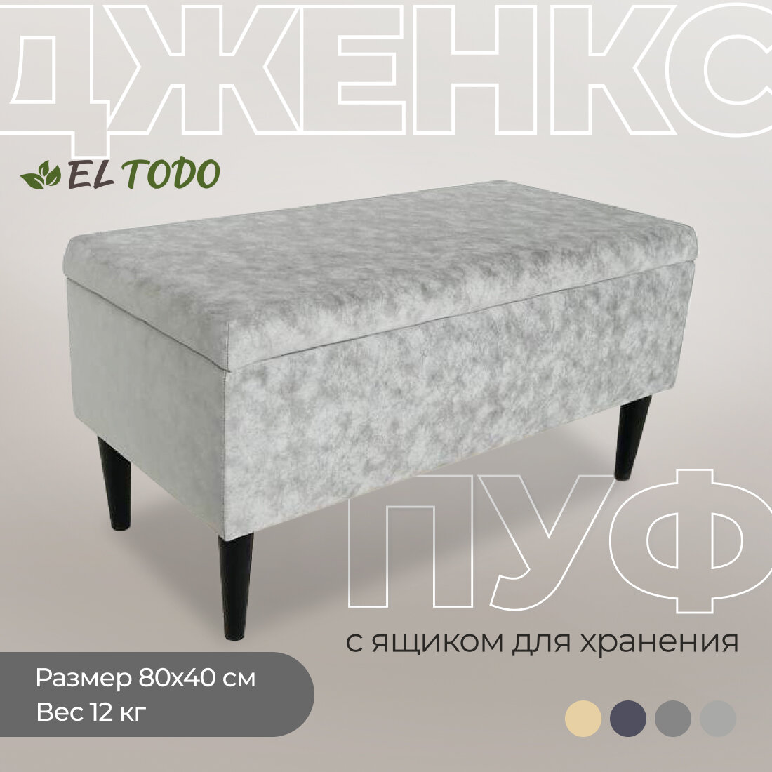 Пуфик в прихожую дженкс от бренда EL TODO сочетает в себе функциональность и стильный дизайн. Его размеры составляют 80х40 см, с ножками высотой 16 см и ящиком для хранения глубиной 18 см, что делает его идеальным выбором для использования в коридоре или прихожей. Пуфик выполнен в сером цвете, обладает мягкой обивкой и удобным ящиком для хранения. Основные характеристики пуфика банкетки в прихожую:- Размеры: 80х40 см, ножки 16 см, ящик 25 см.- Цвет: серый.- Тип: пуфик, банкетка.- Предназначение: для размещения в прихожей, коридоре.- Материал изготовления: ДСП, мебельная ткань.- Наличие ящика для хранения мелочей.- Рекомендуемая нагрузка: 110 кг. Банкетка с ящиком отличается удобством и функциональностью благодаря своему компактному размеру и наличию ящика для хранения. Каркас изготовлен из качественной ДСП, который обтянут мебельной тканью, что придает пуфику комфортную обивку. Черные ножки обеспечивают устойчивость и прочность конструкции. Металлический подъемный механизм на крышке ящика обеспечивает удобство при открывании. Специальные утяжки на крышке, помимо декоративной функции, помогают сохранить целостность ткани. Рекомендуемая нагрузка на пуфик составляет 110 кг. Сборка данной модели пуфика проста и не требует особых навыков - достаточно прикрепить ножки, чтобы он был готов к использованию. Пуфик - идеальное сочетание практичности, стиля и качества, которое станет как функциональным, так и эстетически привлекательным элементом вашего интерьера. Пуфик отлично подойдет для размещения на кухне, в гостиной, прихожей, на балконе, в офисе, и для использования с туалетным столиком.