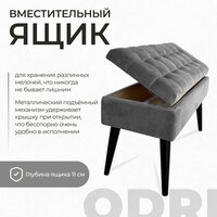 Каркас пуфа, банкетки выполнен из качественной ДСП на который укладывается толстый слой наполнителя, а затем обтягивается мебельной тканью. Конструкция дополняется черными ножками. Пуф имеет вместительный ящик для хранения различных мелочей, что никогда не бывает лишним. Металлический подъёмный механизм удерживает крышку при открытии, что бесспорно очень удобно в исполнении. Специальные утяжки на крышке являются не только элементом декора, благодаря им ткань не будет морщиться и сминаться. Да это еще и просто красиво! Рекомендованная нагрузка 110кг. Сборка пуфа не составит Вам труда, необходимо только прикрутить ножки и О-ля-ля, какая прелесть!