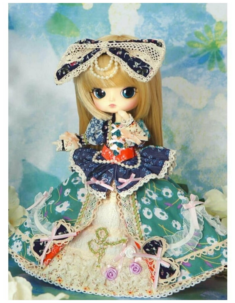 Очаровательная Дана - кукла Дал из серии 'The Prince Of The Grog' (Царевна Лягушка) с полностью подвижным телом, у неё сгибаются руки и ноги. С помощью специального механизма с кнопками под волосами, можно изменять положение глаз и придавать лицу разное выражение. Dal может менять взгляд из стороны в сторону. На глазах у куклы длинные ресницы. У Даны прямые светлые волосы, украшенные нарядным бантом, нежное личико с лёгким румянцем, розовые губки и огромные глаза ярко-синего цвета.