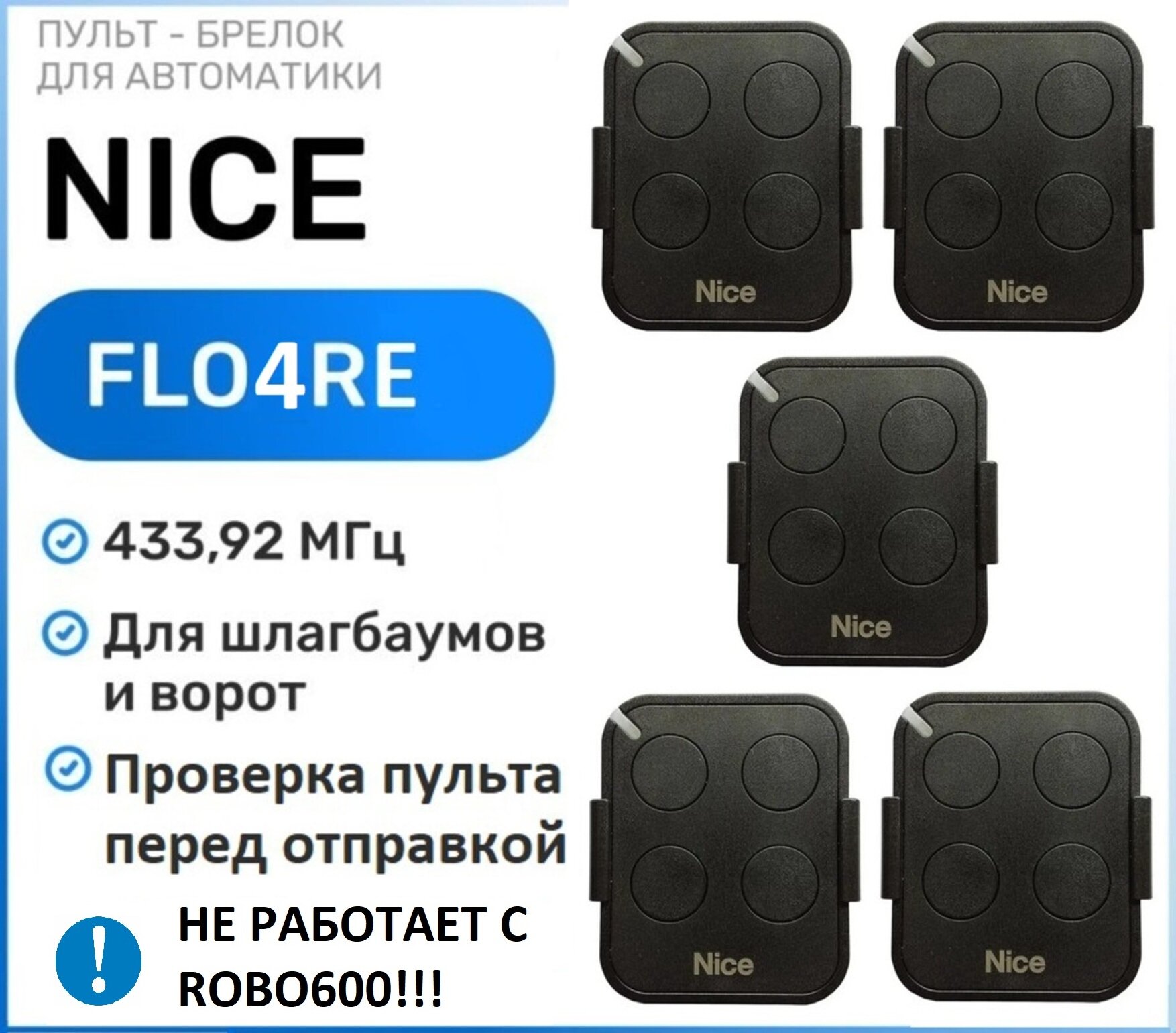 Обучение в приемник.1. На блоке нажать кнопку один раз (менее чем на 1 сек.).2. На пульте NICE FLO4RE нажать обучаемую кнопку на 3-4 сек, после индикатор на блоке мигнет 3 раза. Это означает успешную запись. Безопасность использования: динамический код обеспечивает высокий уровень безопасности, не копируемый код.