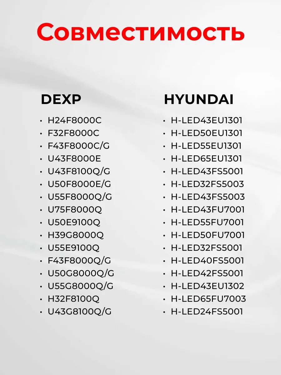 | Совместимые модели | AMCV LE-43ZTFS25, AMCV LE-55ZTUS30, DEXP F32F8000C, DEXP F43F8000C/G, DEXP H24F8000C, DEXP U43F8000E, DEXP U43F8000Q, DEXP U43F8100Q/G, DEXP U50F8000E/G, DEXP U55E9100Q, DEXP U55F8000Q/G, DEXP U75F8000Q, HARTENS HTY-55UHD11B-S2, HIPER H24YQ2200GR, HIPER H32YQ2200GR, HIPER U55YQ2200GR, HIPER U65YQ2200GR, HYUNDAI H-LED43FS5003, Hiper U43YQ2200GR, Hiper U50YQ2200GR, Leff 32H530T, Novex NVX-32H219MSY, Novex NVX-39H211MSY, Novex NVX-43H211MSY, Novex NVX-50U321MSY, Novex NVX-50U329MSY, TELEFUNKEN TF-LED55S04T2SU, Vekta LD-24SR4815BS, Vekta LD-43SU8821BS, Vekta LD-50SU8815BS, Vekta LD-50SU8921BS, Vekta LD-55SU8815BS, Vekta LD-55SU8921BS, Yuno ULX-24TCS221, Yuno ULX-24TCSW222, Yuno ULX-39TCS222 |