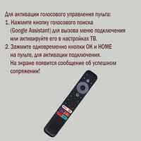 Обязательно сверяйте свой пульт с фото на сайте. Пульт с голосовым управлением. 1. Нажмите кнопку голосового поиска (Google Assistant) для вызова меню подключения или активируйте его в настройках ТВ. 2. Зажмите одновременно кнопки OK и HOME на пульте, для активации подключения. На экране появится сообщение об успешном сопряжении!