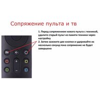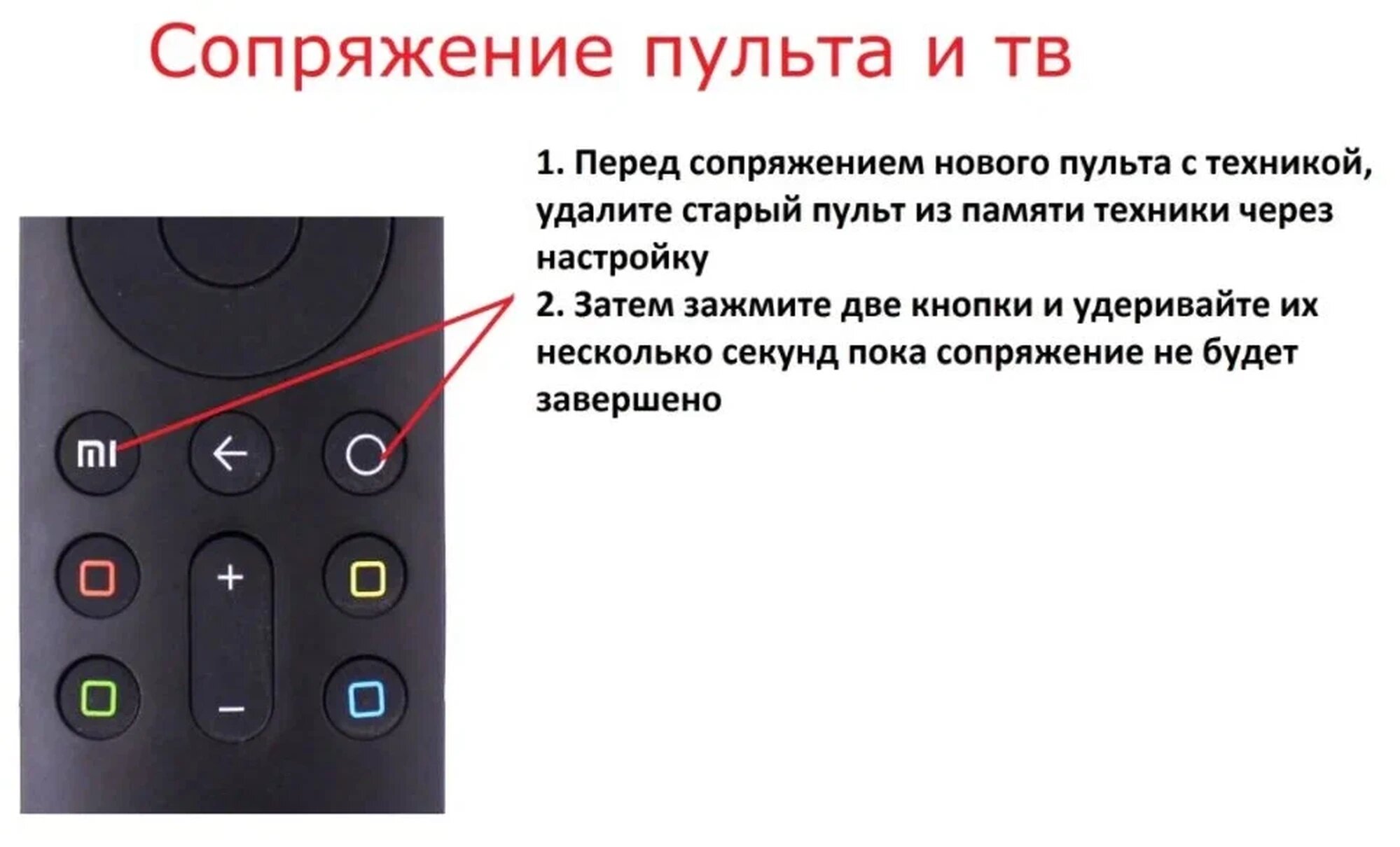 Для работы пульта необходимо произвести сопряжение пульта с телевизором. Для этого нужно: 1. Установить батарейки в пульт. 2. Включить телевизор с помощью кнопки питания. 3. Находясь напротив телевизора на расстоянии не более 5 метров одновременно нажать кнопки "MI" + "О" на 3-5 секунд, после сопряжение будет завершено.