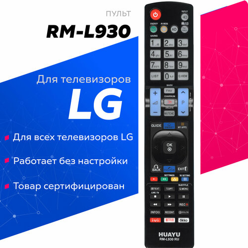 Универсальный телевизионный пульт дистанционного управления HUAYU RM-L930 RU для всех телевизоров LG / ЛЖ / ЛДЖ / элджи! Пульт ДУ подойдет для любого телевизора LG без какой либо настройки, сразу после установки батареек. Выбирайте этот ПДУ, если он устраивает вас по функционалу и внешнему виду, рекомендуется для замены пультов в схожих корпусах для вашего удобства. Внимание! Некоторые функции могут быть не доступны с вашей моделью ТВ, если на родном пульте не было таких кнопок. Пульт произведен в соответствии с высокими мировыми стандартами качества и безопасности, что подтверждается соответствующей сертификацией товаров HUAYU.