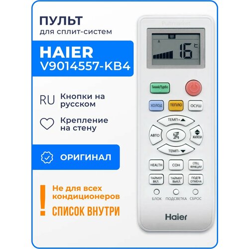 Оригинальный пульт Haier V9014557 KB4 для кондиционера. Пульт поставляется с креплением на стену. Для работы пульта требуются две мизинчиковые батарейки (нет в комплекте). Перед оформлением заказа убедитесь, что ваш пульт был точно такой же, или найдите модель вашей сплит-системы в списке ниже (полный список моделей на фотографиях): Haier AS07GA4HAA, AS07NA3HAA, AS07NM5HRA, AS07TT4HRA, AS09NA5HRA, AS09NA6HRA-S, AS09NM5HRA, AS09TB3HRA, AS09TH3HRA, AS09TT4HRA, AS12GB3HAA, AS12NB5HRA, AS12TB3HRA, AS12TT4HRA, AS12TL5HRA-A, AS18GF3HAA, AS18ND3HAA, AS18TL5HRA-A, AS18TT4HRA, AS24NE3HAA, AS24TL5HRA-A, AS24TT4HRA, HSU-07HEK203/R2, HSU-07HEK303/R2, HSU-07HNM03/R2, HSU-07HNM103/R2, HSU-07HRDN103/R3, HSU-07HRM103/R3, HSU-07HNE03/R2, HSU-07HT03/R2, HSU-07HT103/R2, HSU-07HTDN03/R2, HSU-07HTL103/R2, HSU-07HTM03/R2, HSU-07HTM04/R2, HSU-07HTT03/R2, HSU-07HTT03/R3, HSU-09HEK203/R2, HSU-09HLC203/R2, HSU-09HNH103/R2, HSU-09HNE03/R2, HSU-09HRDN103/R3, HSU-09HRM103/R3, HSU-09HT03/R2, HSU-09HTDN03/R2, HSU-09HTL103/R2, HSU-09HTM03/R2, HSU-09HTM103/R2, HSU-09HTT03/R2, HSU-09HTT103/R2, HSU-09HTT103/R3, HSU-09HUN103/R2, HSU-09HUN203/R2, HSU-12HRDN103/R3, HSU-12HRM103/R3, HSU-12HNE03/R2, HSU-12HT203/R2, HSU-12HTDN03/R2, HSU-12HTL103/R2, HSU-12HTM03/R2, HSU-12HTT03/R2, HSU-12HTT03/R3, HSU-12HUN103/R2, HSU-12HUN203/R2, HSU-18HEK203/R2, HSU-18HLT03/R2, HSU-18HTL103/R2, HSU-18HTT03/R2, HSU-18HTT03/R3, HSU-18HUN103/R2, HSU-18HUN203/R2, HSU-18HUN303/R2, HSU-24HEK203/R2, HSU-24HNE03/R2, HSU-24HT203/R2, HSU-24HTL103/R2, HSU-24HTL203/R2, HSU-24HTT03/R2, HSU-24HTT103/R2, HSU-24HTT103/R3, HSU-24HUN103/R2, HSU-24HUN203/R2, HSU-36HNH03/R2