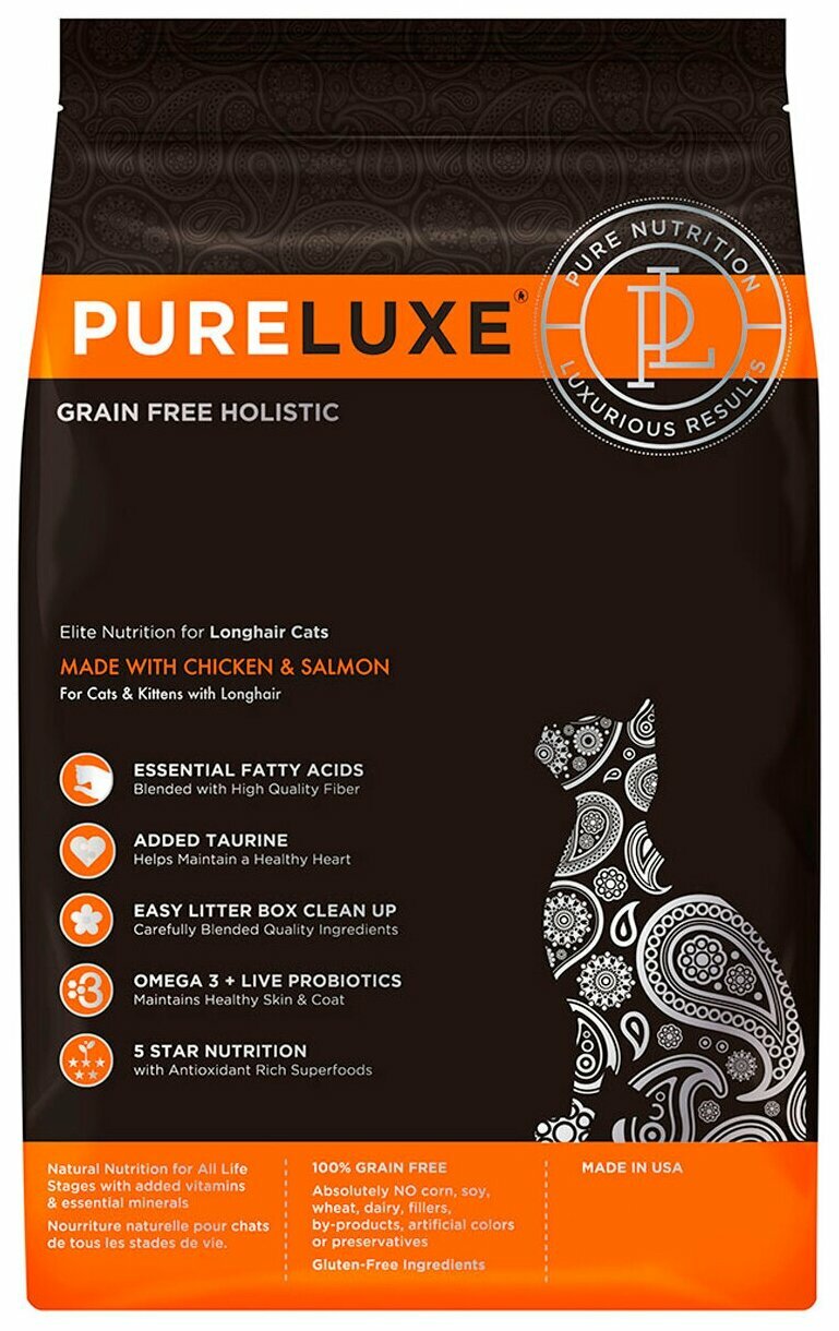 Куриное филе (19%), молотая курица (19%), сушеный нут, сушеный горошек, молотый лосось (11%), куриный жир (сохраненный смешанными токоферолами), льняное семя, филе лосося, натуральный ароматизатор, томатный жмых, сушеная клюква, кокосовое масло, сушеная бурая водоросль, соль, сушеный корень цикория, хлорид холина, витамины (добавка с витамином Е, добавка с ниацином, пантотенат кальция, ацетат витамина А, мононитрат тиамина, гидрохлорид пиридоксина, добавка с рибофлавином, добавка с витамином D3, биотин, добавка с витамином B12, фолиевая кислота)сушеные яблоки, сушеная морковь, семена тыквы, экстракт юкки Шидигера, хлорид кальция, минералы (сульфат железа, оксид цинка, карбонат кальция, оксид марганца сульфат меди, хелат железа, хелат марганца, хелат цинка, хелат меди, селенит натрия, карбонат кобальта, дигидройодид этилендиамин), смешанные токоферолы, *таурин, куркума, сушеный продукт ферментации Enterococcus faecium, сушеный продукт ферментации Lactobacillus acidophilus и сушеный продукт ферментации Lactobacillus casei, экстракт розмарина.
