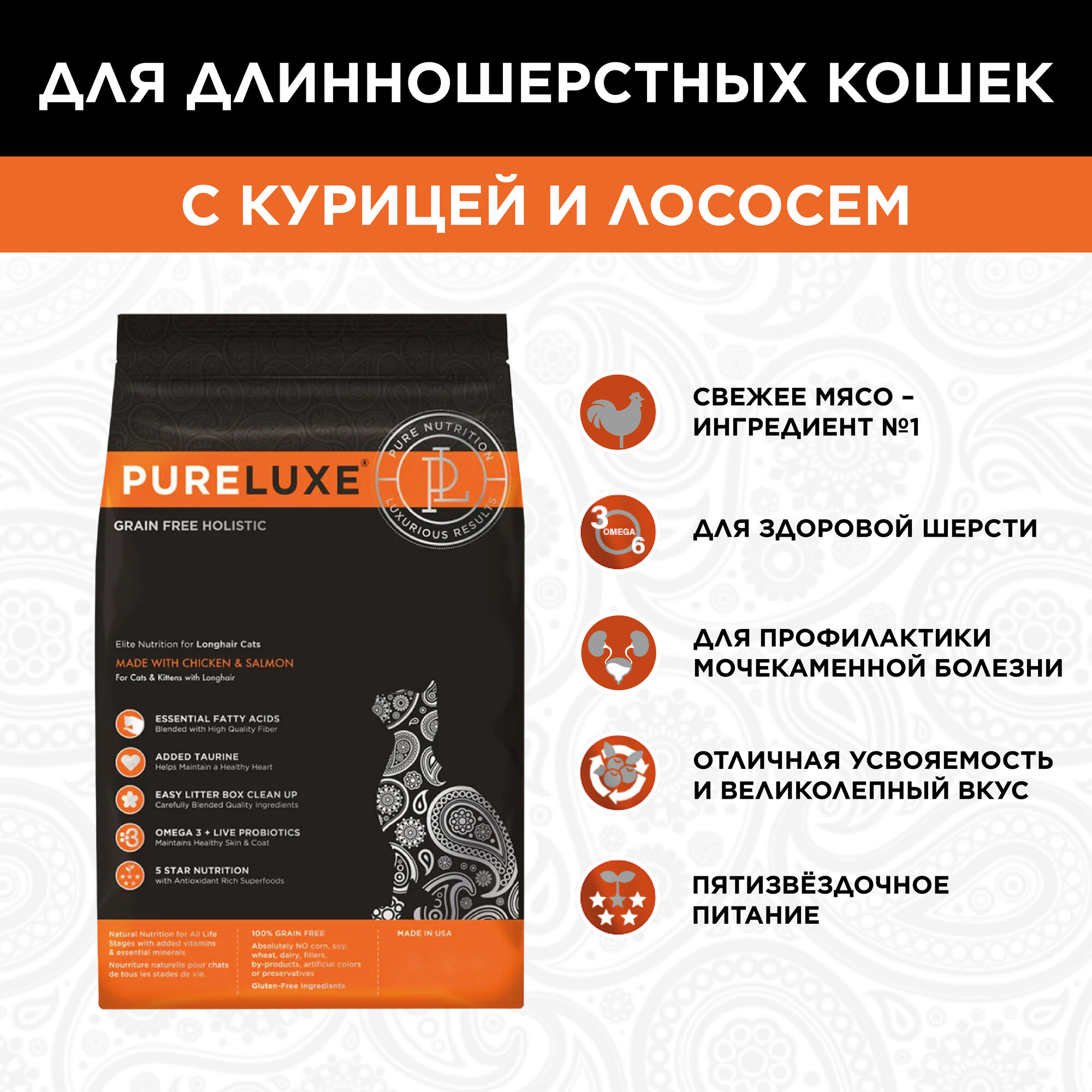 Сочетание ненасыщенных омега-3 и омега-6 жирных кислот, витамина E и цинка в легко доступной хелатной форме оказывают максимальный эффект на здоровье кожи, способствуют устранению перхоти, придают блеск и эластичность шерсти.