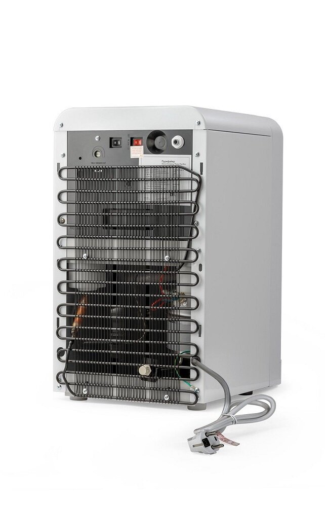 Компрессорная система охлаждения способна охладить 2 литра воды в час до температуры 5-10°C (бак холодной воды 3,8 литра, мощность компрессора – 100 Вт).