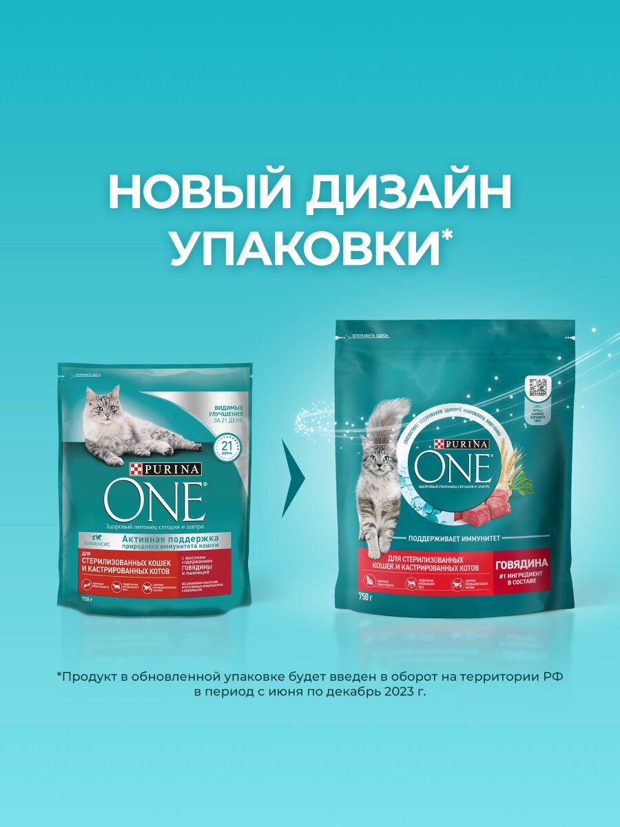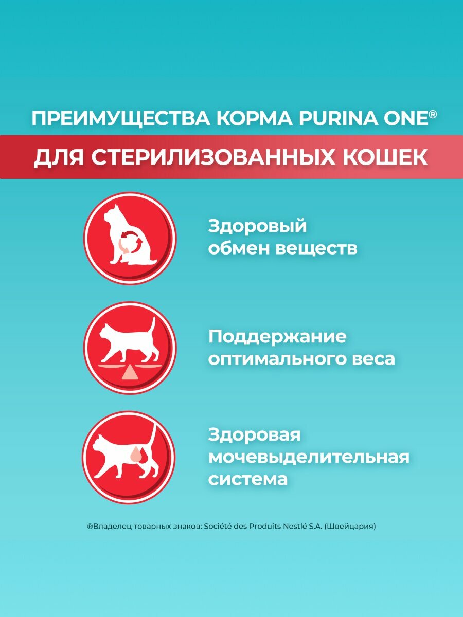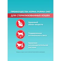 Корм для кошек Purina ONE (пурина УАН) — полнорационный корм, разработанный ветеринарами и диетологами Purina специально для стерилизованных кошек и кастрированных котов старше 1 года. Корм Purina ONE — это: • Поддержание здорового веса: более высокое* содержание белка по отношению к содержанию жира• Поддержание здорового обмена веществ после стерилизации• Здоровая мочевыделительная система благодаря балансу минеральных веществ• В составе натуральный пребиотик — цикорий, который поддерживает здоровую микрофлору кишечника и уменьшает неприятный запах от туалетного лотка**• Формула, которая поддерживает иммунитет вашей кошки, здоровье пищеварительной системы и блестящую шерсть, обеспечивая видимые результаты для здоровья питомца сегодня и завтра. Рекомендации по кормлению: • Суточная норма зависит от погодных условий, физических особенностей и активности питомца• Следите, чтобы у кошки всегда была свежая питьевая вода• Дополняйте рацион влажными кормами Purina ONE для поддержания водного баланса• Переводите на новый корм постепенно: в течение 7 дней плавно переводите исходный рацион на корм Purina ONE Purina ONE. Экспертное питание — видимый результат. *+15% по сравнению с кормом Purina ONE для взрослых кошек **Согласно проведенному командой Purina исследованию: "Влияние цикория на запах стула кошки", 2002, Purina Pet Care, Сент-Джозеф, США