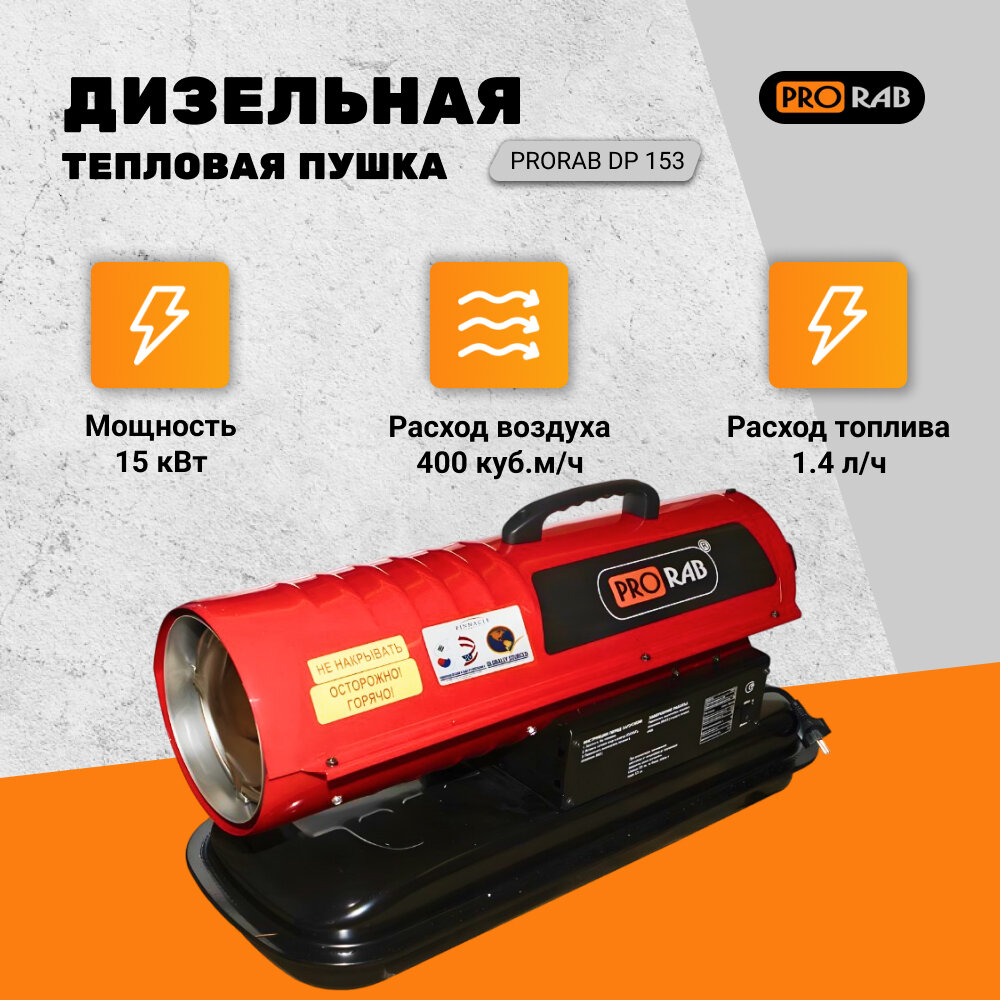 Купить Пушка тепловая дизельная PRORAB DP 153, тепловентилятор прямого нагрева с доставкой по всей России. Пушка тепловая дизельная PRORAB DP 153, тепловентилятор прямого нагрева: сравнение цен, характеристики, фото, актуальное наличие и цены.