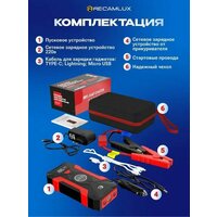 | Комплектация | Пусковое устройство, Сетевое зарядное устройство 220В, Кабель для зарядки гаджетов (Type-C, Lightning, Micro USB), Сетевое зарядное устройство от прикуривателя, Стартовые провода, Чехол |