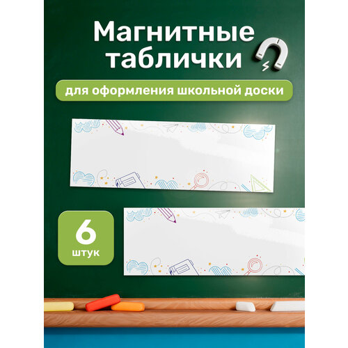 Комплект состоит из 6 пустых магнитов размером 10 × 30 см. Дизайн набора выполнен в школьной тематике. Магниты удобно стыковать между собой, создавая единую информационную зону на доске.
