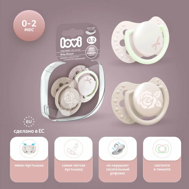 "Пустышка силиконовая Lovi коллекции Baby Shower имеет уникальный дизайн, разнородный силикон и симметричную форму, повторяющую форму соска.