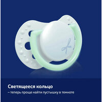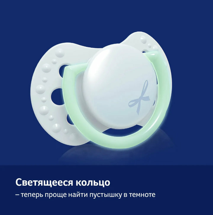 Кольцо пустышки светится в темноте, облегчает поиск пустышки ночью или при слабом освещении.