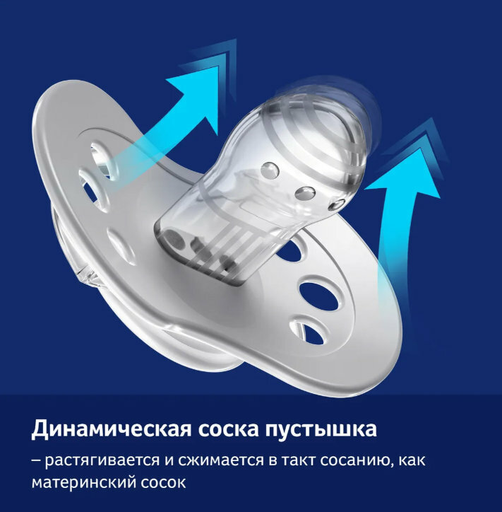 Соска пустышка изготовлена из гетерогенного силиконового слоя, который обеспечивает сжимание и расширение соски при сосательных движениях ребенка; симметричная форма соски основана на структуре соска.