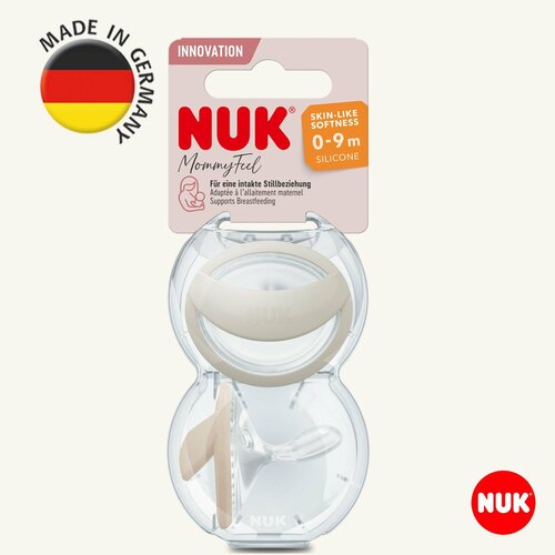 NUK MommyFeel соска-пустышка из силикона для комфортного сочетания с грудным вскармливанием, для детей 0-9 месяцев, 2 штуки в упаковке. Уникальная форма пустышки для детей в период грудного вскармливания. Мягкий и знакомый: очень мягкая силиконовая пустышка ортодонтической формы. Рекомендуется акушерами, консультантами по грудному вскармливанию и врачами: губы ребенка прилегают к соске, как при грудном вскармливании. Не содержит бисфенол-А, по 2 штуки в упаковке, контейнер многоразового использования. NUK MommyFeel – придает ребёнку ощущение постоянного присутствия мамы. Отношения между мамой и младенцем во время кормления грудью очень нежны и бережны. Основываясь на этом, соска-пустышка NUK MommyFeel имеет особую конструкцию, которая позволяет успокоить младенца и не препятствует грудному вскармливанию. Соска из мягкого силикона имеет форму схожую с сосковым полем груди кормящей женщины. Это создает у малыша ощущение, схожее с присутствием мамы. Еще одно преимущество пустышки в том, что соска касается только губ ребенка и нежная чувствительная кожа вокруг рта остается открытой. Таким образом, соска-пустышка NUK MommyFeel не оставляет следов от давления и предотвращает появление раздражений на коже. С самого рождения дети учатся правильно захватывать сосок материнской груди во время кормления - соска-пустышка NUK MommyFeel имитирует такое же положение губ ребенка. И, конечно же, NUK MommyFeel имеет оригинальную форму соски NUK, наиболее удобную для зубов, челюсти и нёба ребенка, что делает NUK MommyFeel лучшим выбором для детей, находящихся на грудном вскармливании. Пустышку можно подвергать гигиенической обработке в микроволновой печи. Для этого наполните контейнер водой до нижней линии разметки, вставьте пустышку в контейнер соской вниз и поместите в микроволновую печь. Перед использованием пустышки внимательно ознакомьтесь с инструкцией по её применению, которая находится внутри упаковки.