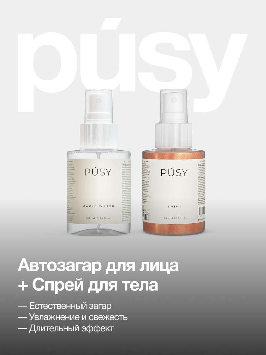 Набор MAGIC WATER PÚSY – спрей для лица и шеи спрей мист для тела с блестками. Автозагар поможет получить ровный загар, не подвергая кожу негативному воздействию солнца. С ним вы сможете забыть про тональный крем, основу под макияж и BB-крем. Автозагар для лица в форме спрея имеет приятную легкую текстуру и благодаря простому и комфортному нанесению обеспечивает загар без пятен и ровный тон кожи без макияжа. Автозагар спрей Pusy предназначен строго для нанесения на лицо, шею и зону декольте. Начните использования с 5-7 пшиков, далее самостоятельно подбирайте оптимальное количество пшиков для достижения желаемой интенсивности загара. Эффект появляется спустя 2-6 часов после нанесения. Внимание! Для того, чтобы избежать пятен перед нанесением автозагара обязательно нужно тщательно очистить кожу при помощи легкого пилинга скатки PUSY.