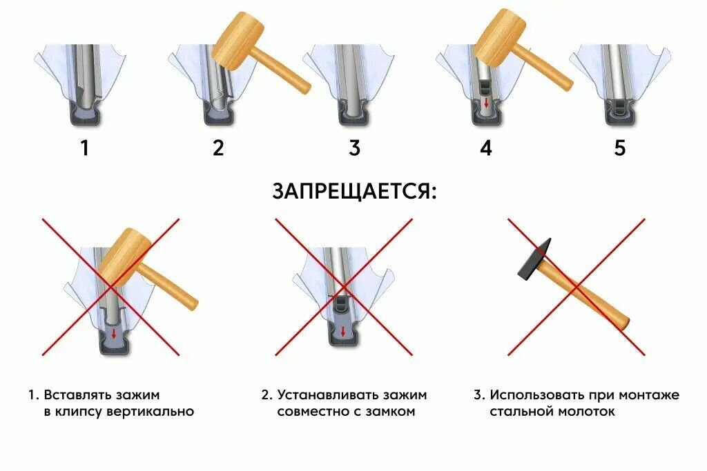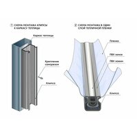 Пленка укладывается в алюминиевую клипсу и закрепляется с помощью ПВХ-зажима и ПВХ-замка.
