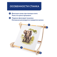 Пяльцы-рамка выполнены из бука. С помощью защелкивающихся клипс канва легко крепится к поворотным валикам. Преимущество заключается в том, что рамка позволяет надежно фиксировать канву в клипсах и ткань не нужно пришивать. Натяжение и перемещение канвы осуществляется поворотом валиков. Для удобства вышивания предлагаем пяльцы-рамки ( PRK-"Gamma") использовать вместе с напольной стойкой-держателем ( PNS-"Gamma"). Вышивать будет намного удобнее, потому что при помощи вспомогательной планки (PDS-"Gamma")пяльцы-рамки фиксируются к напольной стойке и можно отрегулировать наклон и высоту рамки, приняв удобное положение тела. У пялец-рамок на боковых планках сформированы дополнительные отверстия для крепления к ним вспомогательной планки. Внимание! Во избежании порчи конструкции не меняйте положение деталей при затянутых болтах. Всегда ослабляйте гайки перед изменением положения деталей.