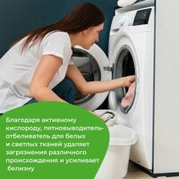 Средство содержит активный кислород, который проникает в структуру волокон и активно разрушает молекулы загрязнений. Благодаря этому, вы можете быть уверены в его высокой эффективности против различных видов пятен, включая грязь, пищу, жир и пот. Пятновыводитель подходит как для предварительной обработки тканей, так и для добавления в стирку, что делает его универсальным решением для вашего домашнего ухода за бельем.