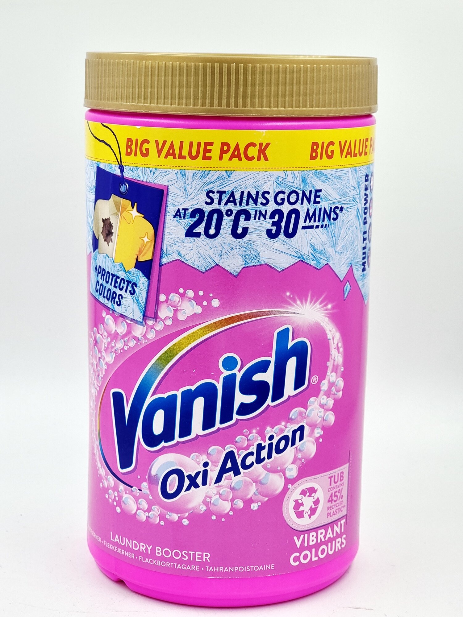 Эффективное удаление пятен: Vanish Oxi Action обеспечивает быстрое и эффективное удаление пятен с цветного белья всего за 30 секунд.