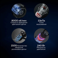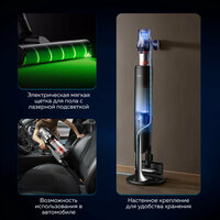 | Особенности конструкции | BLDC-мотор, автоматическое сматывание шнура, вертикальная парковка, индикатор заполнения пылесборника, место для хранения насадок, регулятор мощности на корпусе, управление мощностью на рукоятке, функция самоочистки |