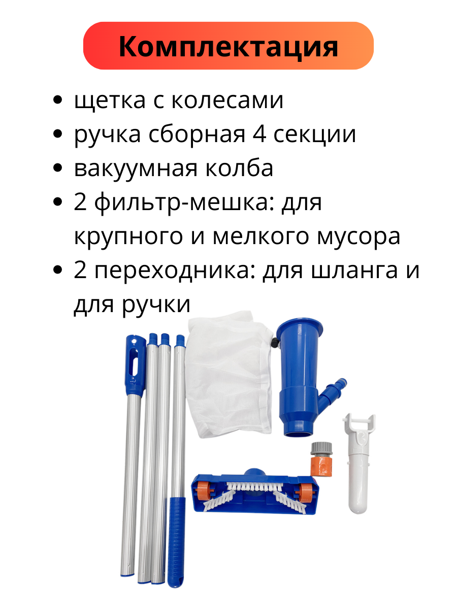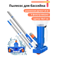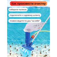 Пылесос для бассейна прекрасный помощник в уходе за бассейном. Щетка для бассейна с функцией вакуумного очищения справляется с очисткой дна бассейна и поверхности воды. Ручной пылесос для бассейна подходит для чистки стационарных и сборных бассейнов. Удивительно, что пылесос для воды работает без электричества и насоса! Для очистки бассейна достаточно соединить щетку со шлангом, подключенным к водопроводу и опустить щетку на дно. Конструкция и размеры водного пылесоса обеспечивают образование вакуума от напора воды из шланга, и мусор со дна затягивается в мешок-фильтр вакуумного очистителя бассейна. Используя подводный пылесос, вы сразу делаете два дела: очищаете бассейн от мусора и обновляете в нем воду. Совмещайте добавление воды в бассейн с его очисткой при помощи этого водяного пылесоса, и ваш прудик или бассейн будет в идеальном состоянии! Многих удивляет количество мусора, собранного беспроводным пылесосом при первой вакуумной чистке, хотя на их взгляд бассейн казался чистым. Этот пылесос для воды имеет в комплекте 4 фильтр-мешка: 1 мешок сетчатый для сбора крупного мусора, например, листвы и 3 фильтр-мешка для мелкого мусора, например, песка, осадка. Этот недорогой пылесос для бассейна прост в использовании, легко собирается и разбирается. Его можно использовать не только как очиститель дна бассейна, но и для сбора мусора с поверхности воды. Для этого щетку для бассейна нужно поднять на поверхность и перевернуть отверстием вверх: весь мусор с поверхности будет затягиваться в фильтр-мешок. Таким образом, вакуумный очиститель бассейна работает как донный пылесос и как очиститель поверхности воды. Обратите внимание, что составная ручка в максимальной сборке имеет длину 1,6 м. Размер захватывающей поверхности щетки 18х8 см. Пылесосом не только удобно пользоваться, его легко хранить. Щетка пылесос для чистки бассейна разбирается и при хранение занимает совсем мало места.