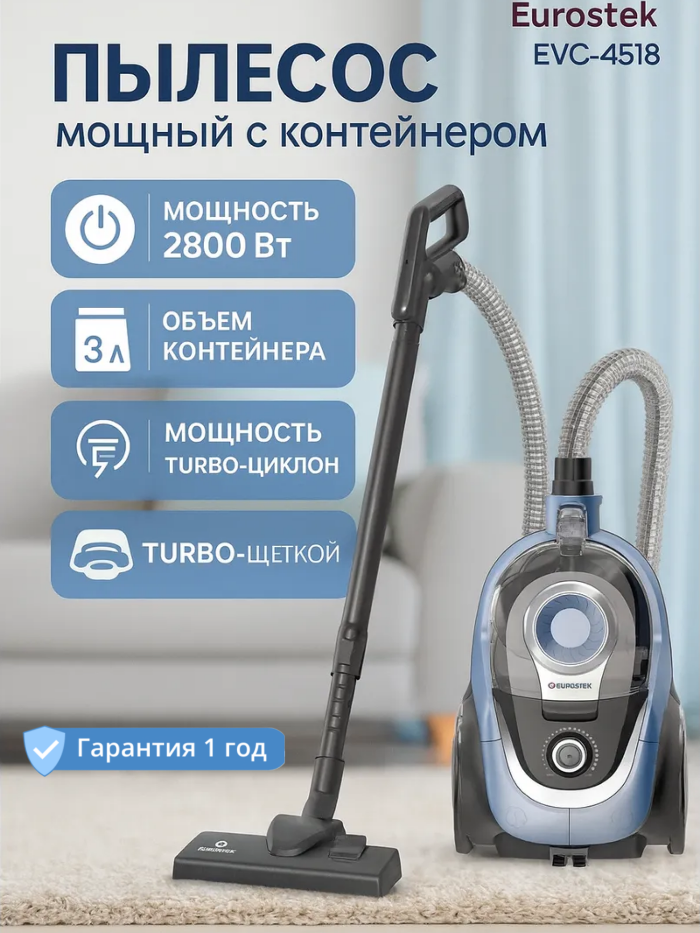 Купить Пылесос для дома Eurostek EVC-4518, Мощность всасывания 500 Вт, Автоматическая смотка шнура, Голубой/Серый/Черный с доставкой по всей России.