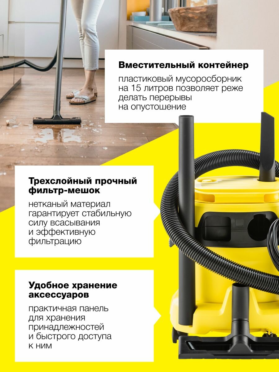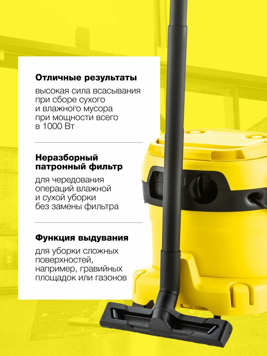 Купить Пылесос для дома Karcher WD 2 Plus V-15/4/18/C (1.628-011.0) Керхер 1000Вт, 15л, функция выдувания, 3-слойный нетканый мешок, неразборный патронный фильтр, 2 насадки с доставкой по всей России. Пылесос для дома Karcher WD 2 Plus V-15/4/18/C (1.628-011.0) Керхер 1000Вт, 15л, функция выдувания, 3-слойный нетканый мешок, неразборный патронный фильтр, 2 насадки: сравнение цен, характеристики, фото, актуальное наличие и цены.