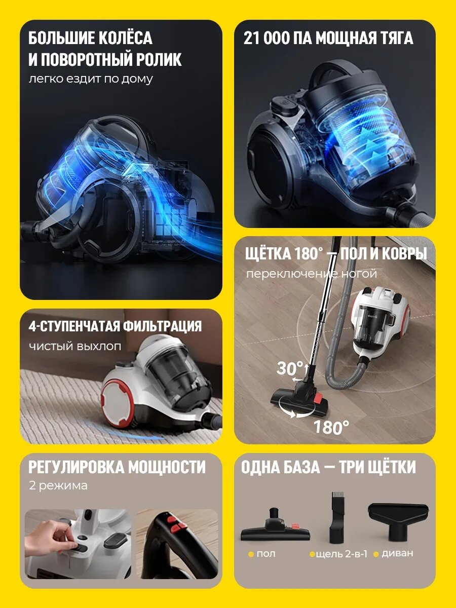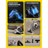 | Особенности конструкции | автоматическое сматывание шнура, вертикальная парковка, индикатор заполнения пылесборника, место для хранения насадок, регулятор мощности на корпусе, управление мощностью на рукоятке, функция самоочистки |