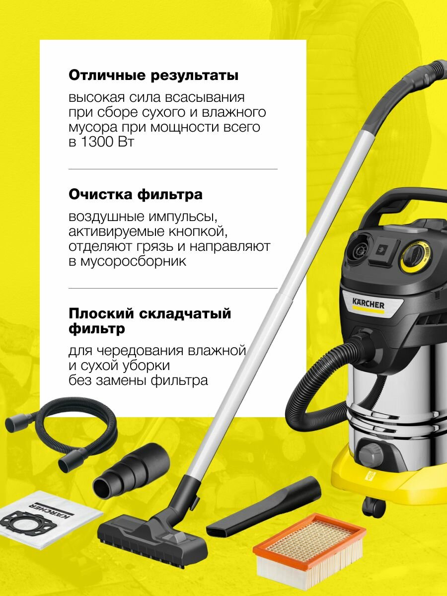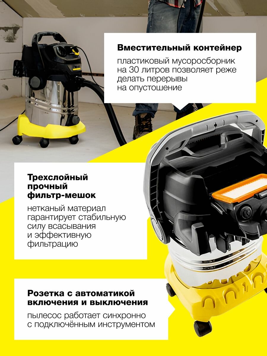 Пылесос хозяйственный Karcher KWD 6 P S V30/8/22/T 1300Вт, 30л, нетканый фильтр-мешок, складчатый фильтр, штепсельная розетка: сравнение цен, характеристики, фото, актуальное наличие и цены.