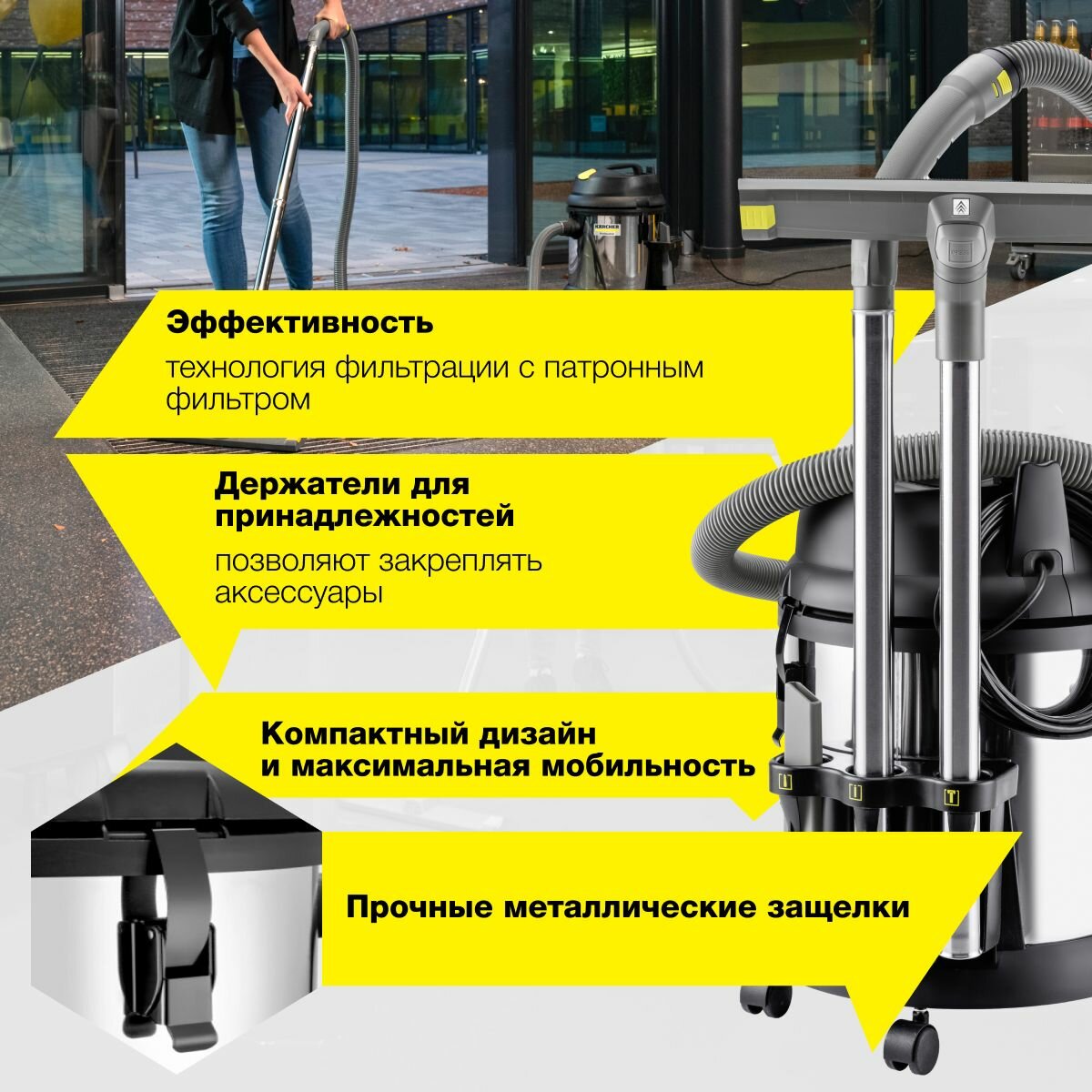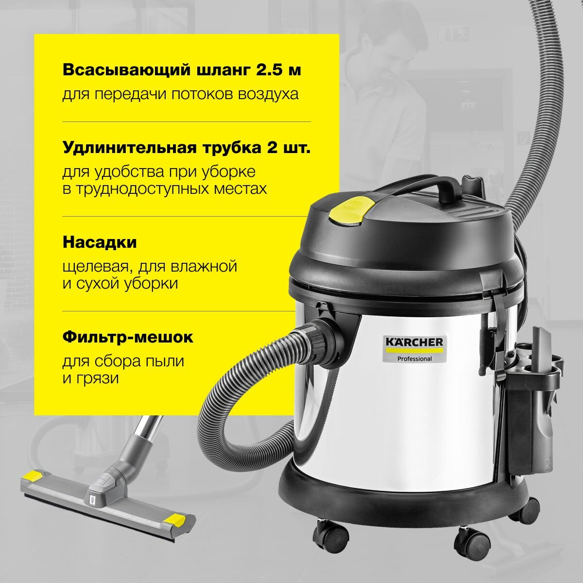 Пылесос для влажной и сухой уборки Karcher NT 27/1 Me Adv *EU 1.428-114.0 - это компактный, сверхманевренный и удобный в использовании пылесос для влажной и сухой уборки, подходящий для всех видов коммерческого применения. Его мощная турбина создает впечатляющую силу всасывания. Устройство поставляется с патронным фильтром увеличенной площади фильтрации, версия Adv. Поплавковая система защиты турбины прерывает всасывание в тот момент, когда контейнер полностью заполнен на жидкостью. Практичная система креплений обеспечивает быструю и легкую замену аксессуаров. Пять легко вращающихся поворотных роликов гарантируют отличную маневренность и устойчивость. Корпус пылесоса NT 27/1 Me Adv изготовлен из нержавеющей стали, стойкой к кислотам и щелочам и рассчитанный на долгий срок службы, а также имеет держатели для аксессуаров и крючок для аккуратного хранения кабеля питания. Эргономичная переносная ручка гарантирует легкость и удобство при транспортировке. NT 27/1 Me Adv имеет круглый отбойник, который защищает как само устройство, так и окружающие стены и мебель от повреждений. В дополнение к стандартной комплектации, имеется широкий выбор дополнительных принадлежностей, с помощью которых эта модель пылесоса может быть оптимально сконфигурирована для выполнения самых разных задач.