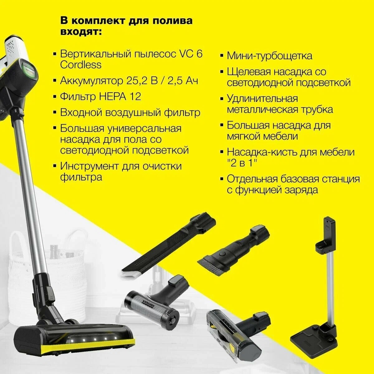 Обширная комплектация гарантирует разносторонние возможности: пылесос вертикальный Karcher VC 6 Cordless ourFamily Extra позволяет эффективно решать любые задачи уборки в доме – с максимальным комфортом и в течение продолжительного времени. Бесщеточный двигатель постоянного тока мощностью 250 Вт обеспечивает легкое выполнение любых уборочных работ.