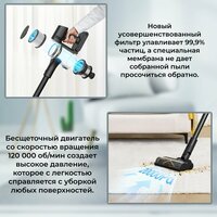 | Особенности конструкции | BLDC-мотор, вертикальная парковка, датчик распознавания загрязненности, индикатор заполнения пылесборника, место для хранения насадок, регулятор мощности на корпусе, управление мощностью на рукоятке |