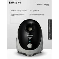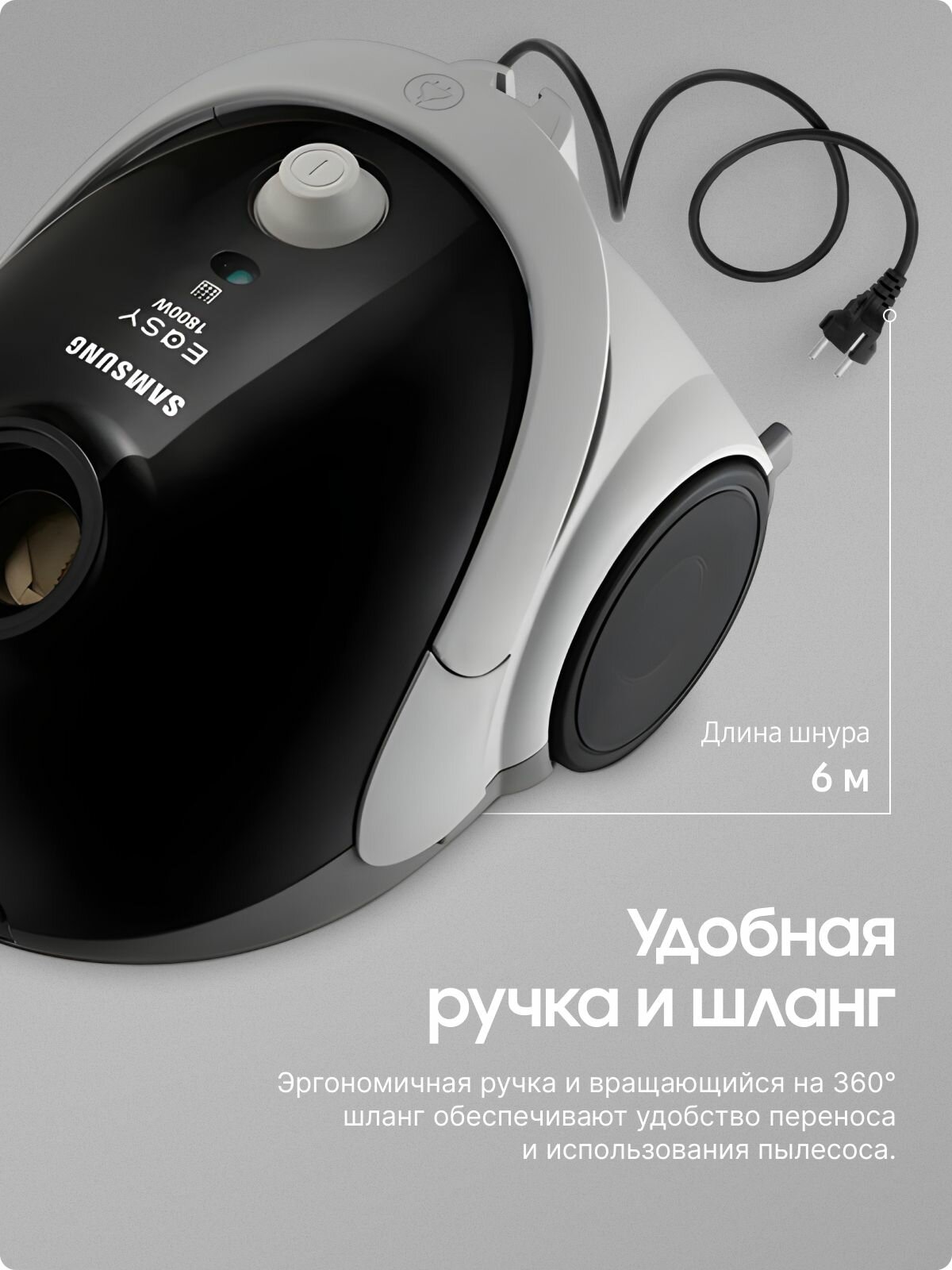 Проводной пылесос с мешком для дома Samsung VCC5241S3K/XEV, 1800 Вт, 2,4 л, с фильтрацией и автосматыванием сетевого шнура, черный: сравнение цен, характеристики, фото, актуальное наличие и цены.