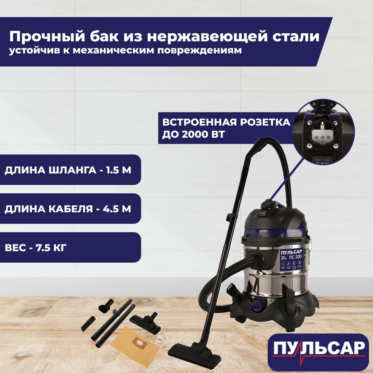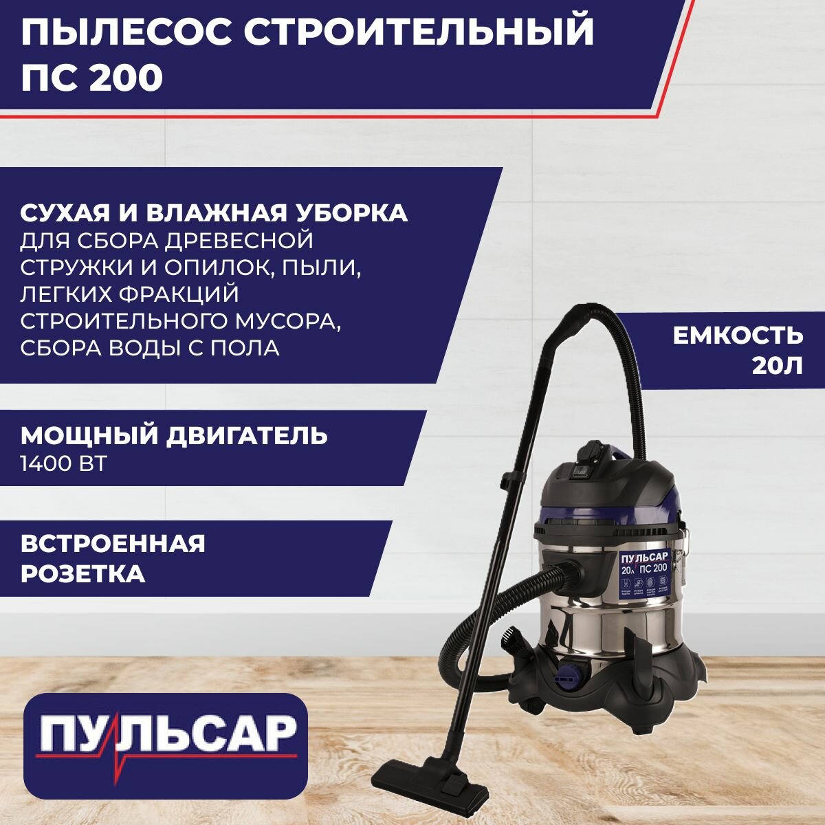 Пылесос строительный / промышленный пульсар ПС 200 (1400 Вт, 20л, HEPA-фильтр, розетка для инструмента до 2000 Вт, шланг 1,5м, 7,5кг): сравнение цен, характеристики, фото, актуальное наличие и цены.