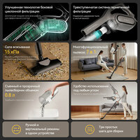 Отличается эргономичным дизайном с продуманной конструкцией: центр тяжести расположен возле ручки, что обеспечивает удобство работы под разными углами. Устройство выполнено в сером цвете с использованием качественного пластика, имеет легкий вес всего 3 кг и компактные размеры, что делает его маневренным при уборке. Двухпозиционная ручка для держания позволяет выбрать наиболее комфортное положение во время уборки, а прозрачная емкость для мусора легко очищается. Благодаря возможности отсоединить ручной пылесос и вертикальной парковке, устройство занимает минимум места при хранении, а длина шнура в 4.5 метра обеспечивает достаточную свободу передвижения по квартире.
