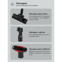 | В комплекте | адаптер для уборки труднодоступных мест, комбинированная насадка, насадка для автомобиля, насадка для ламината и паркета, насадка для мягкой мебели, насадка для сбора жидкости, насадка для твердых покрытий мебели, настенный держатель, удлинительная трубка/шланг, универсальная насадка для сухой уборки, фильтр тонкой очистки, циклонная насадка, щелевая насадка, электрощетка |
