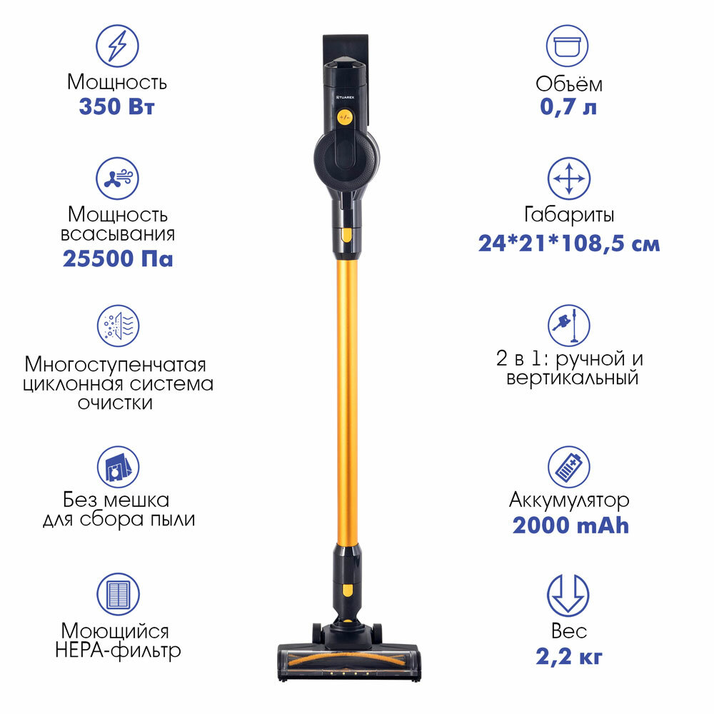 Пылесос вертикальный Tuarex TK-9002, мощность всасывания 125 Вт, HEPA-фильтр, аккумуляторный