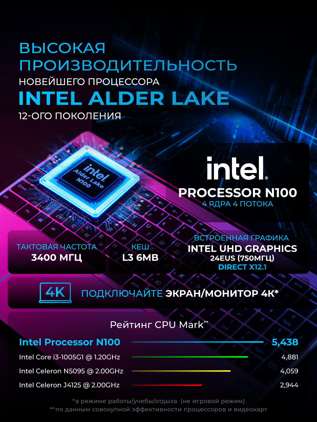 15.6" Intel processor N100 DDR4 16ГБ, SSD 2 ТБ — мощный ноутбук с современным ярким экраном 15.6" и производительным SSD-накопителем. Он идеально подойдёт для работы, учёбы, домашних задач и досуга. Данный ноутбук может использоваться как полноценный ПК благодаря 16ГБ оперативной памяти DDR4 и поддержке Windows 11, что обеспечивает быстрый запуск программ и высокую многозадачность. Для комфортной работы предусмотрена клавиатура с подсветкой.