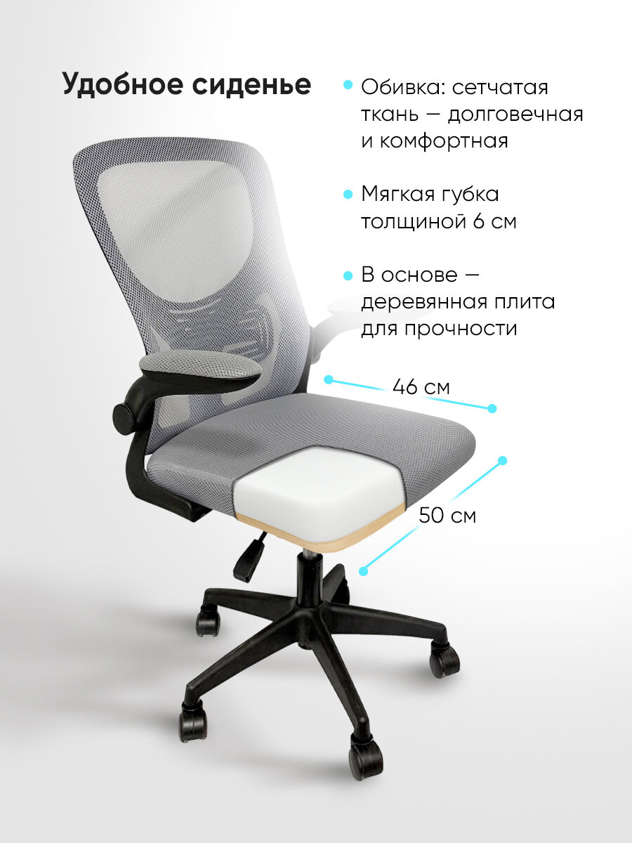 мягкие подлокотники, мягкое сиденье, спинка из сетки
