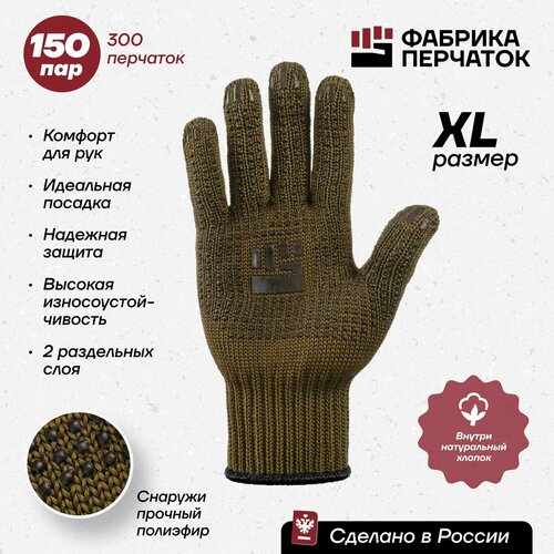 Рабочие хозяйственные перчатки Фабрика перчаток из хб материала 2-слойные с прорезиненным ПВХ покрытием на ладонях и резинкой для надежной защиты рук 7.5 класс, 6 нитей, оливковые, XL, 150 пар