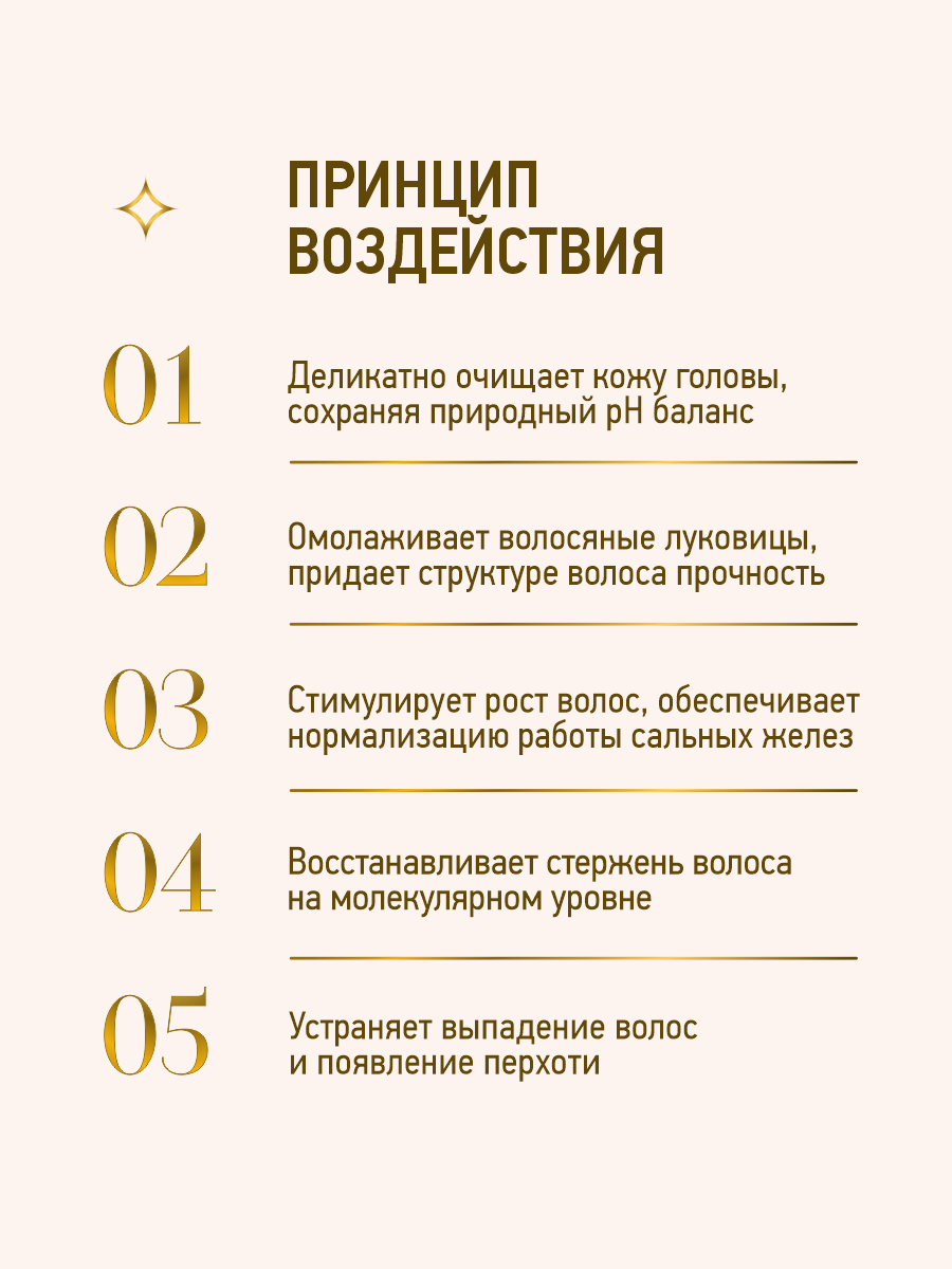 активация роста, антистатик, восстановление, защита от негативного воздействия окружающей среды, очищение, придание блеска, придание мягкости, против выпадения, против перхоти
