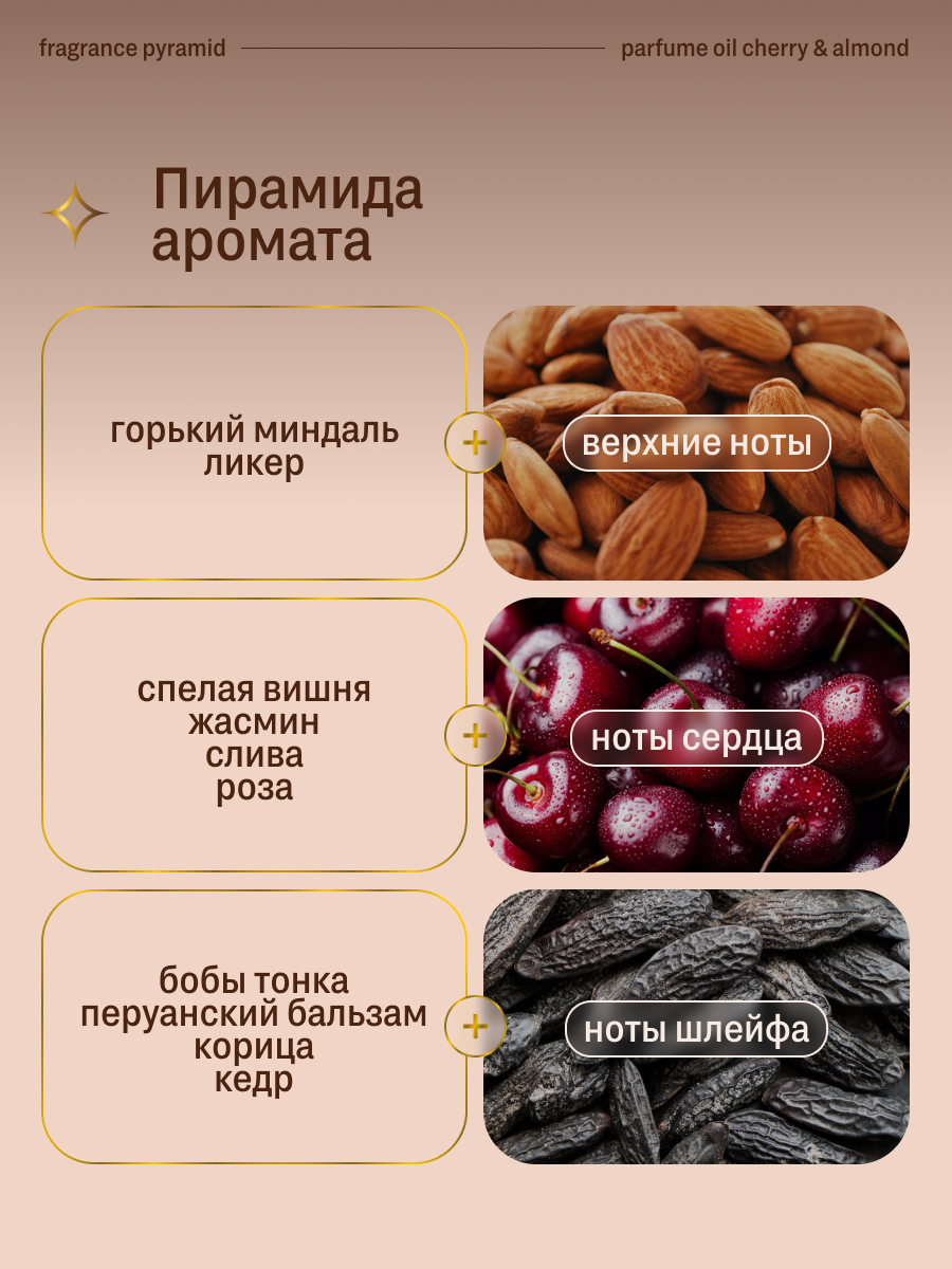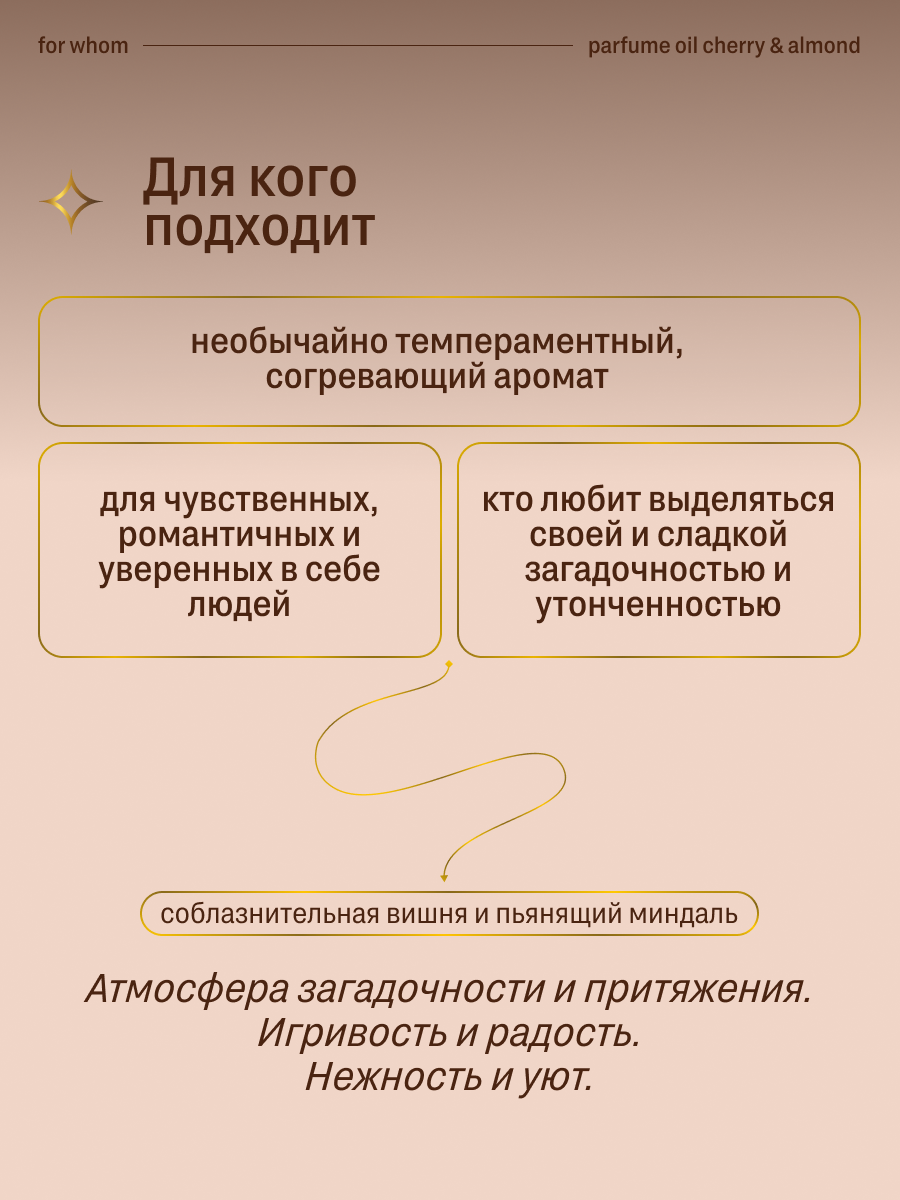 Парфюм женский сладкий необычайно темпераментный, чувственный, согревающий вишневый аромат, нежный сотканный из нот соблазнительной вишни и пьянящего миндаля. Роликовые масляные духи деликатно и натурально раскрываются на коже, становятся насыщенными и стойкими, покоряя эффектным и долгим восточным шлейфом. Формула создана на основе натуральных масел, которые образуют тонкую плёнку, удерживающую молекулы аромата, не позволяя им быстро улетучиться, духи шлейфовые с роликом - стойкие со сладкими ароматом черри. Масляные духи шариковые с феромонами «Вишня и миндаль» оставляют соблазнительную ауру притяжения на вашей коже. Идеальный подарок для девушки. Не содержат спирт. Духи ягодные натуральные для тех, кто ценит продукцию эко. Шариковые духи упакованы в стеклянную баночку 10 мл – что позволять хранить их в сумочке или в автомобиле. Ольфакторная пирамида Верхние ноты: горький миндаль, ликер Ноты сердца: спелая вишня, слива, роза, жасмин Ноты шлейфа: бобы тонка, перуанский бальзам, корица, кедр. Парфюмерия женская имеет сертификат Халяль.