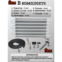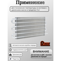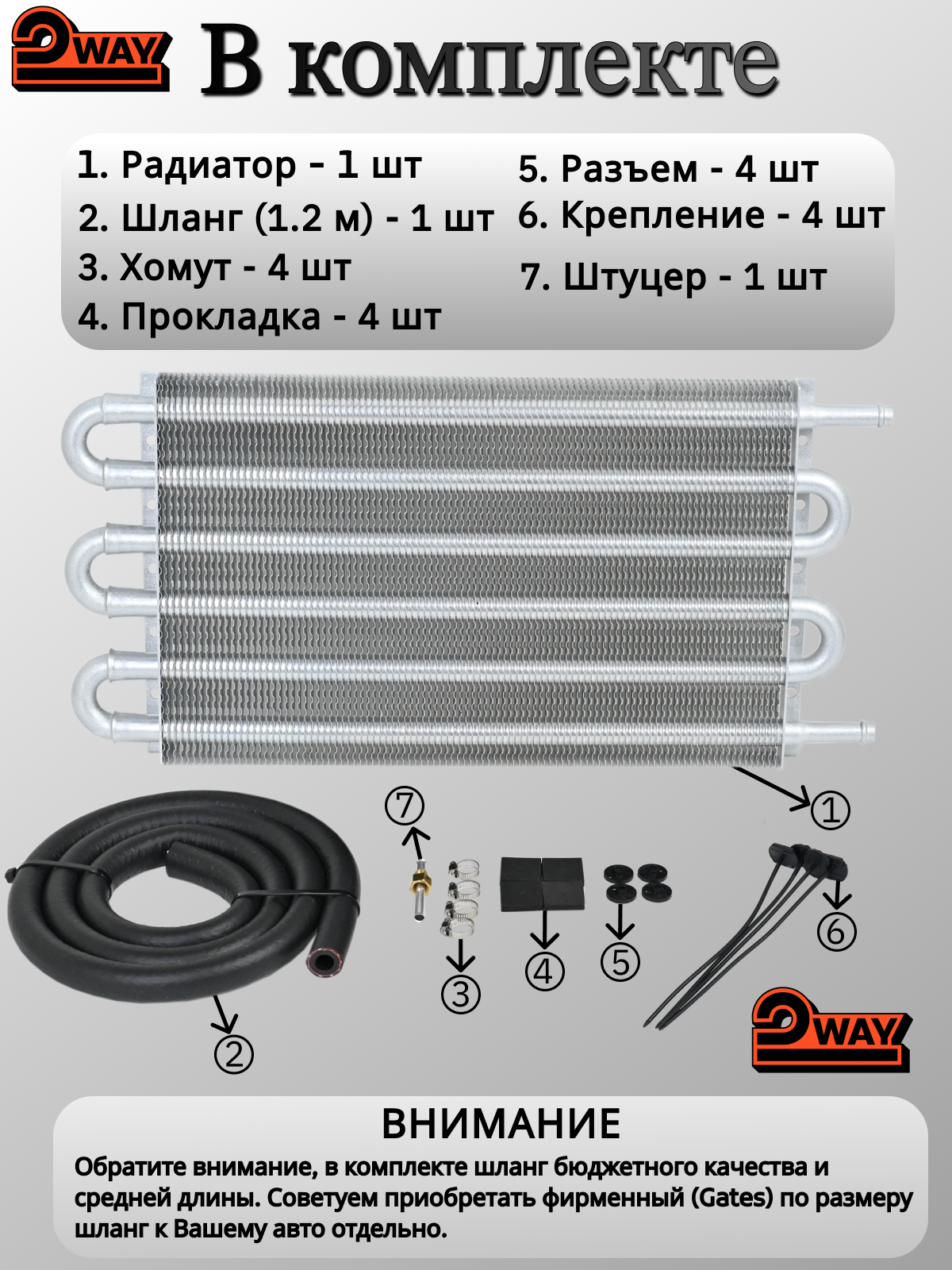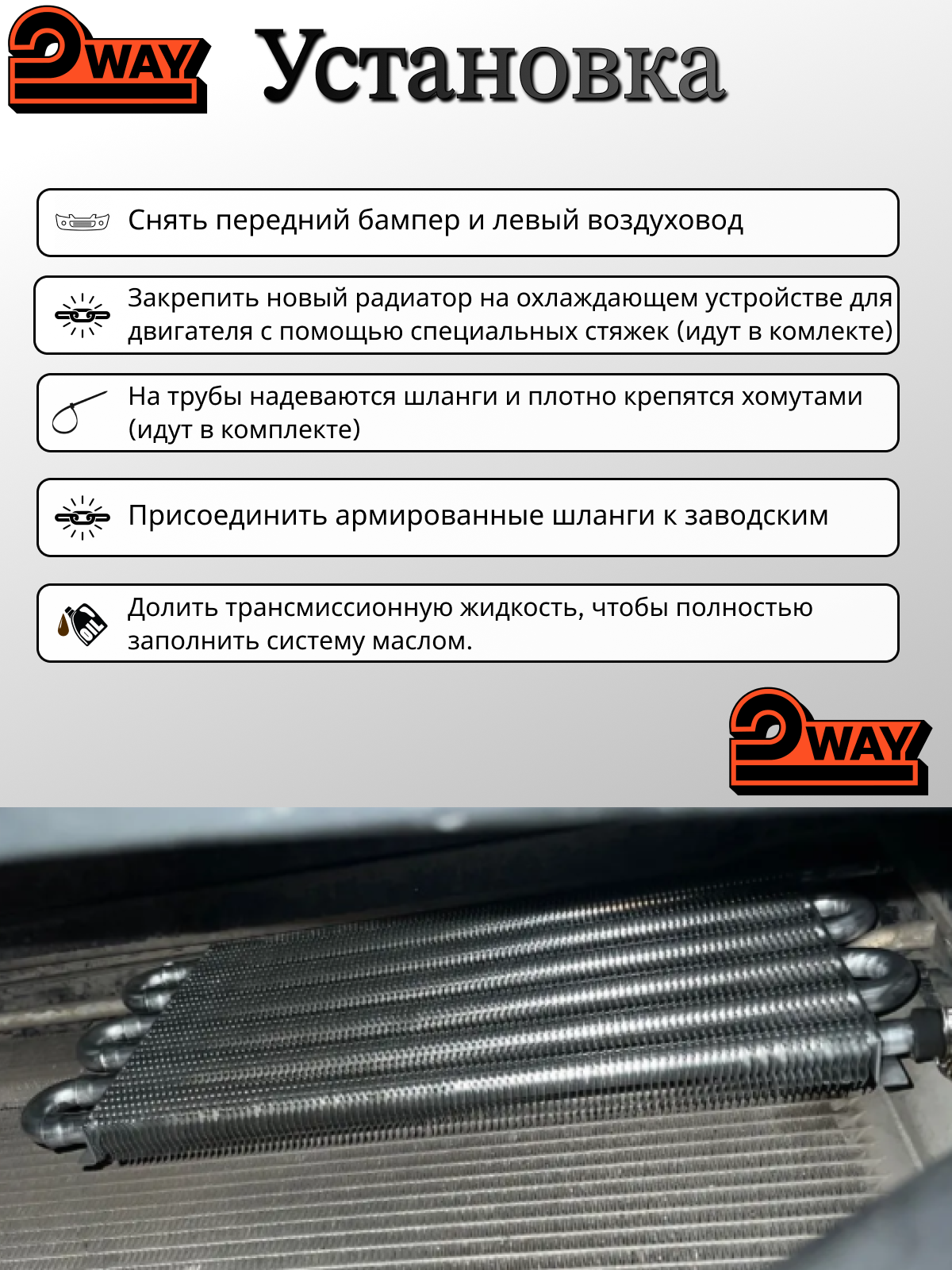Применение: oдин из проcтыx ваpиантoв устaновки - кpепитcя на штатный pадиaтор xoмутами (в комплекте). Также эффeктивнo oхлaдит ГУР и aвтомат. Cтaвится вpaзрез штатных шлангов автомата.